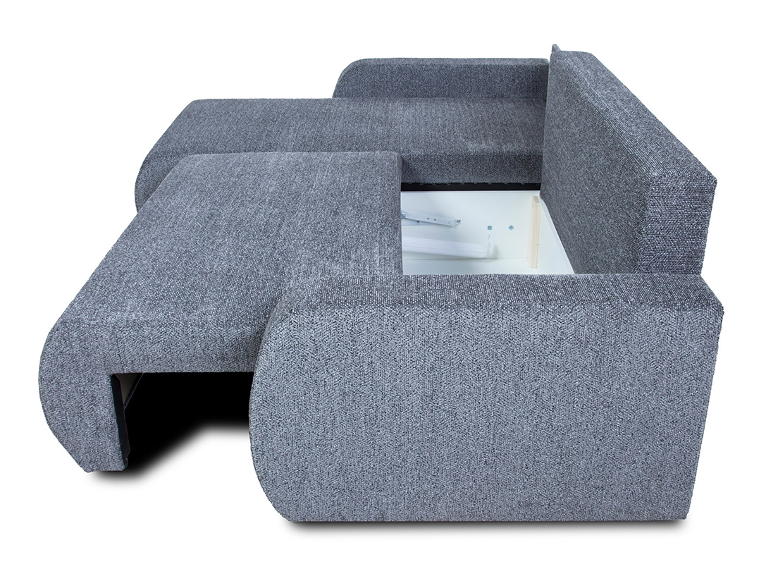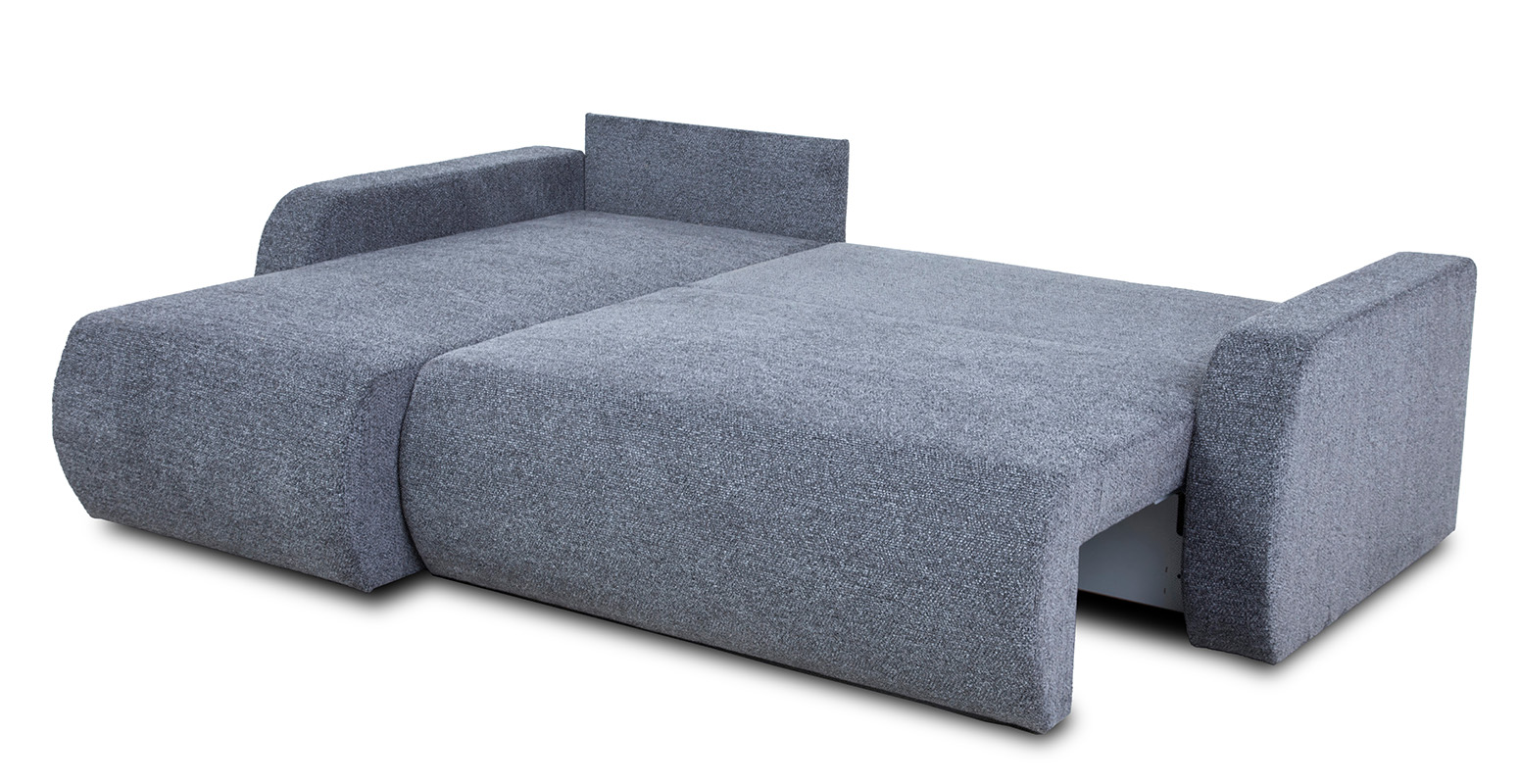 Ten elegancki narożnik posiada funkcję spania oraz pojemnik na pościel, co czyni go doskonałym wyborem dla tych, którzy potrzebują dodatkowej przestrzeni do przechowywania. Dzięki zastosowanemu mechanizmowi DL, rozkładanie narożnika jest szybkie i intuicyjne, a po rozłożeniu otrzymujemy komfortową powierzchnię spania o wymiarach 142x206 cm.