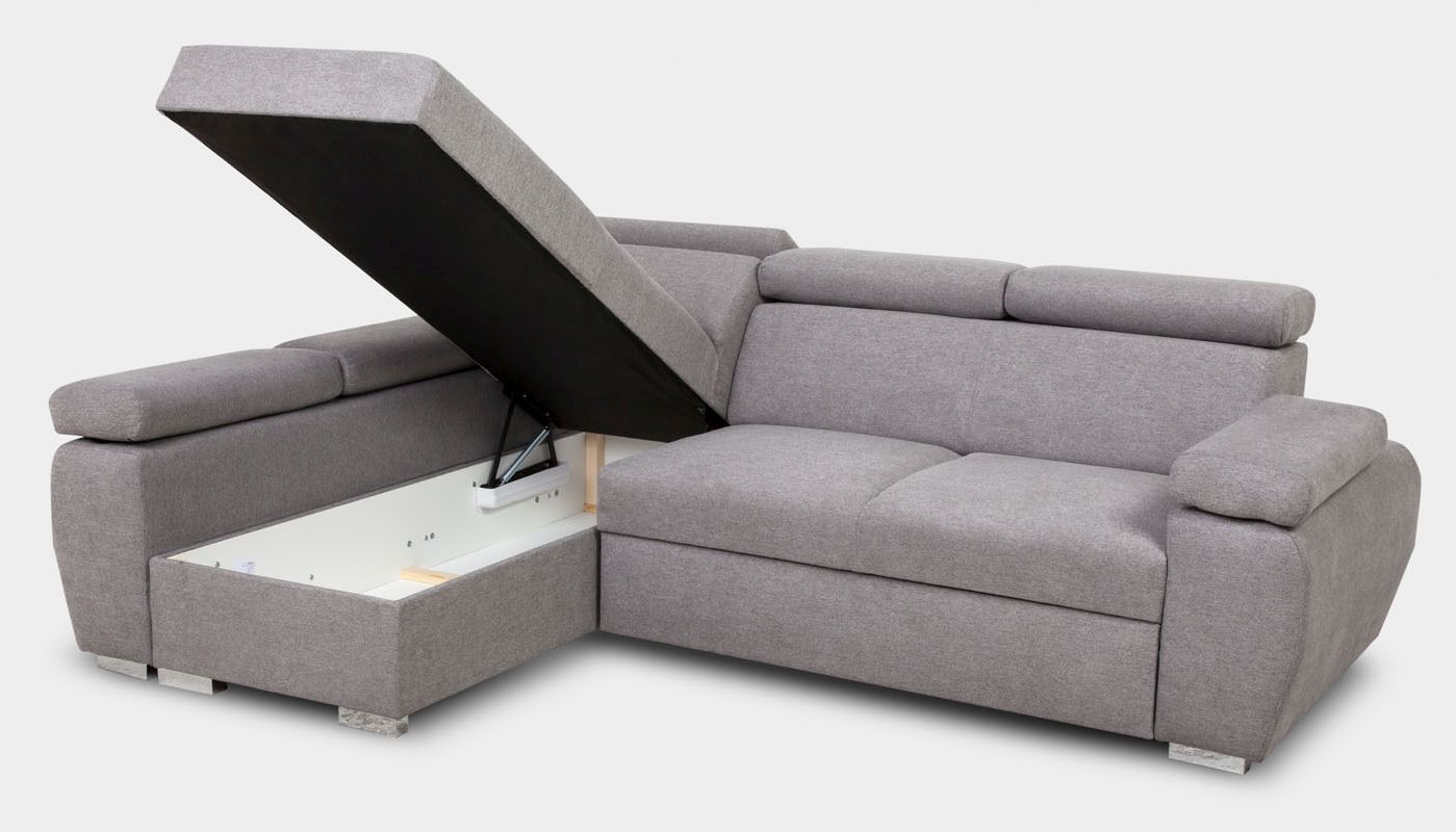 Jedną z kluczowych cech narożnika Berg jest jego funkcja spania, która umożliwia szybkie i łatwe przekształcenie go w wygodne łóżko. Pojemnik na pościel skryty w narożniku to praktyczne rozwiązanie, pozwalające utrzymać porządek w salonie, a jednocześnie mieć wszystkie niezbędne akcesoria do snu zawsze pod ręką.