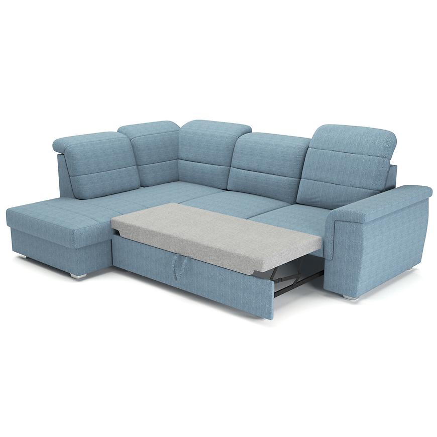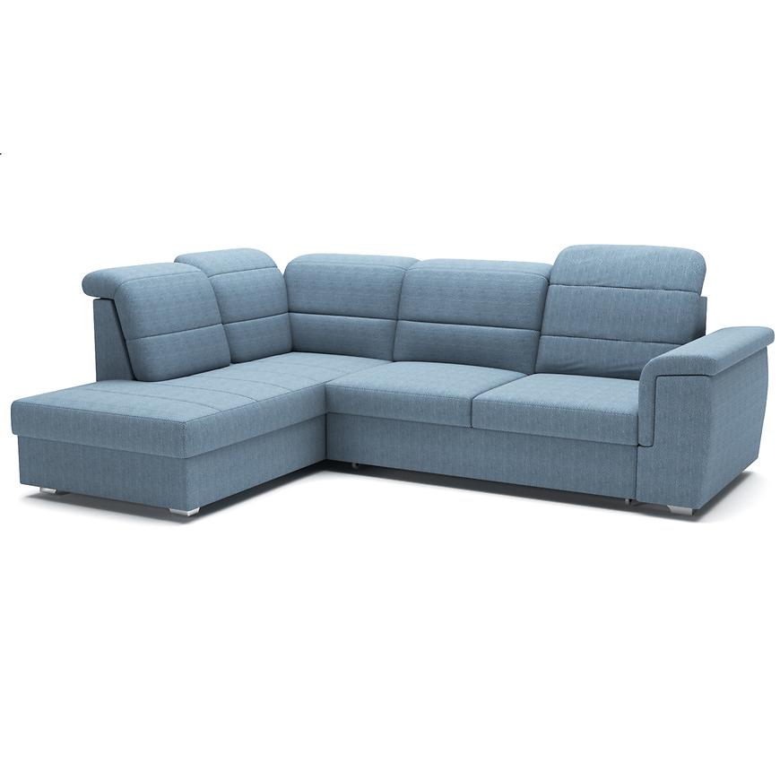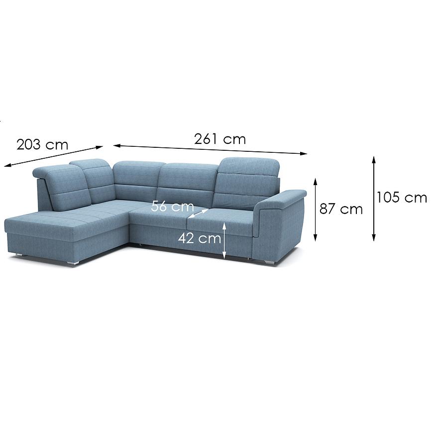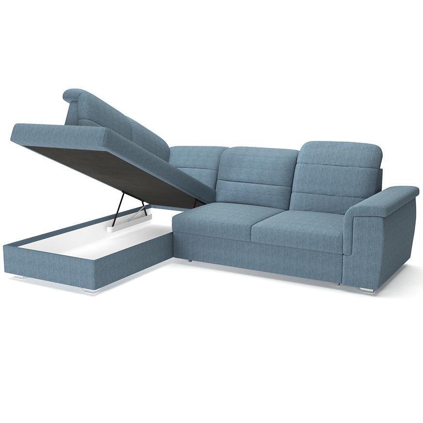 Praktycznym uzupełnieniem jest pojemnik na pościel, w którym bez problemu można przechować kołdrę czy poduszki. Komfort użytkowania podnoszą regulowane zagłówki, pozwalające dopasować oparcie do indywidualnych potrzeb. Całość dopełniają solidne nóżki w srebrnym kolorze, nadające narożnikowi lekkości i nowoczesnego charakteru.