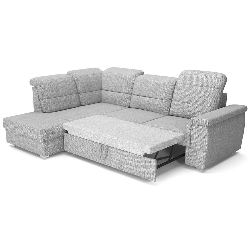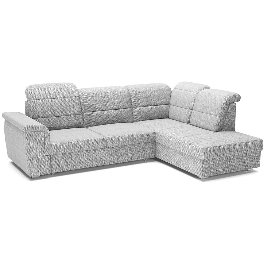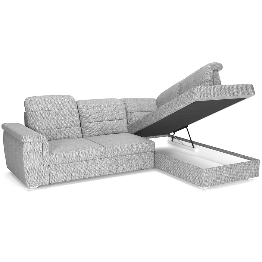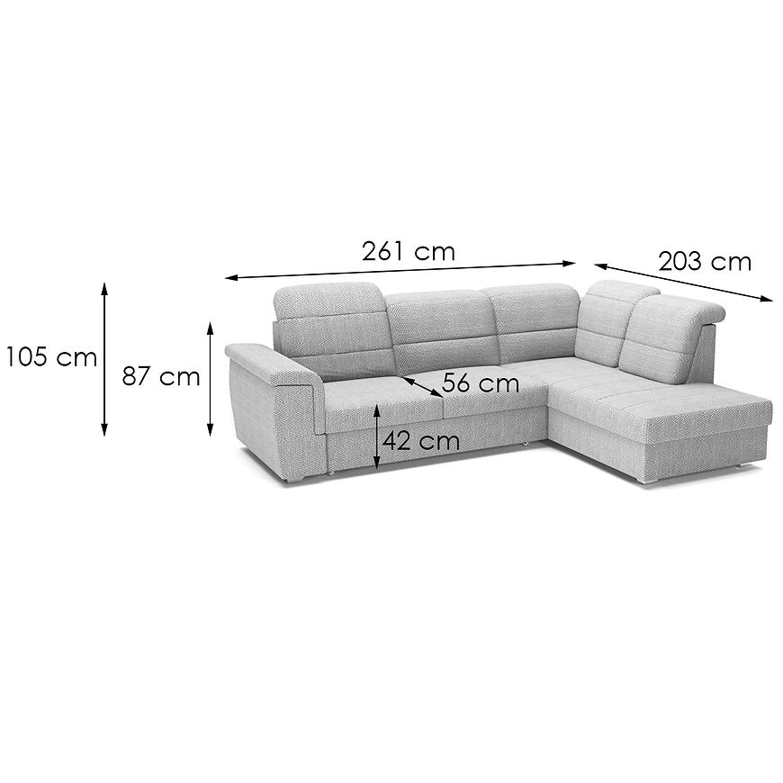 Narożnik Bergamo L Viton 200 prawostronny to duży narożnik w kształcie litery L o wymiarach 261×203 cm i wysokości 87/105 cm. Siedzisko ma wysokość 42 cm i głębokość 56 cm, wypełnione sprężyną falistą. Tapicerka wykonana jest z szarej tkaniny. Narożnik posiada funkcję spania o powierzchni 186×125 cm, rozkładany systemem delfin, z jednym pojemnikiem na pościel. Wyposażony w regulowane zagłówki, nogi w kolorze srebrnym, bez regulowanych podłokietników i oparcia. Nie posiada poduszek ani pufy w zestawie, a elementy ozdobne nie występują. Mebel nie jest modułowy.