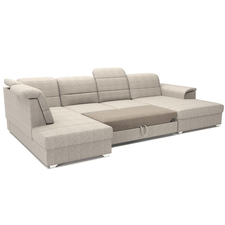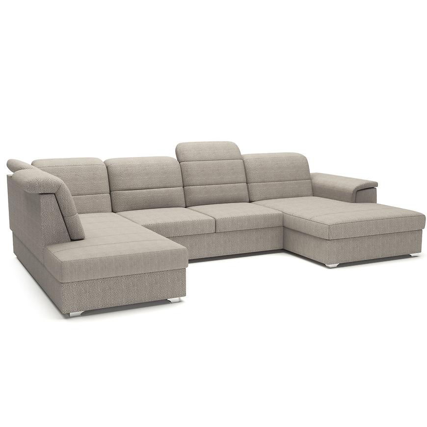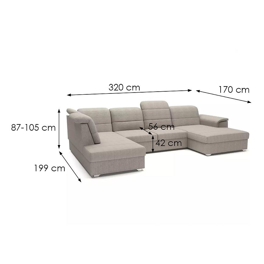 Narożnik Bergamo U Viton 192 prawostronny to duży narożnik w kształcie litery U o szerokości 320 cm i głębokości 199 cm, w eleganckim beżowym kolorze. Siedzisko wypełnione jest sprężyną falistą, co zapewnia wygodę i komfort użytkowania. Narożnik posiada funkcję spania typu „delfin” z powierzchnią spania 255×120 cm oraz jednym pojemnikiem na pościel. Wysokość całkowita wynosi 87/105 cm, wysokość do siedziska 42 cm, a głębokość siedziska 56 cm. Dodatkowo wyposażony jest w regulowane zagłówki, automatyczny mechanizm rozkładania i srebrne nogi. Produkt wymaga samodzielnego montażu i doskonale sprawdzi się w dużych salonach, łącząc funkcjonalność z nowoczesnym stylem.