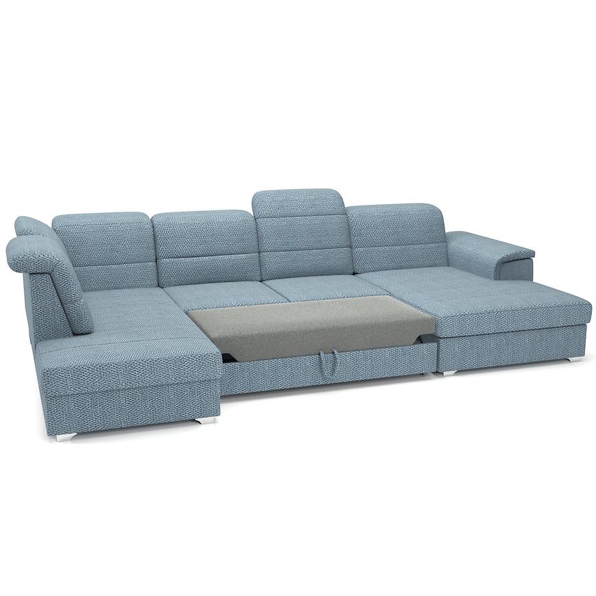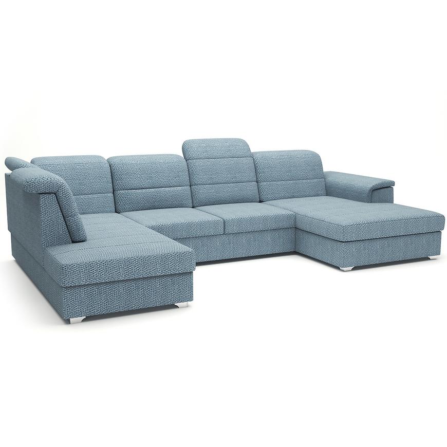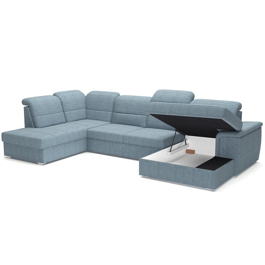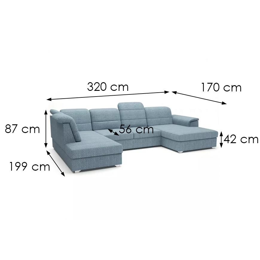 Narożnik Bergamo U Viton 198 prawostronny to duży, komfortowy narożnik w kształcie litery U o szerokości 320 cm i głębokości 199 cm. Tapicerka w kolorze niebieskim wykonana jest z tkaniny, a siedzisko wypełnione sprężyną falistą zapewnia wygodę podczas codziennego użytkowania. Narożnik posiada funkcję spania z mechanizmem typu „delfin”, oferując powierzchnię spania 255×120 cm oraz jeden pojemnik na pościel. Wysokość całkowita wynosi 87/105 cm, wysokość do siedziska 42 cm, a głębokość siedziska 56 cm. Narożnik wyposażono w regulowane zagłówki, automatyczny mechanizm rozkładania i srebrne nogi. Wymaga samodzielnego montażu. Idealny do dużych salonów, łącząc funkcjonalność i elegancki wygląd.