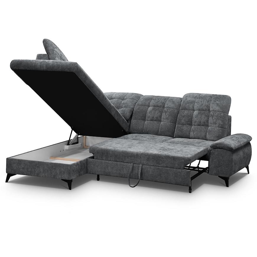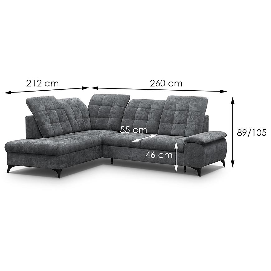 Dodatkowym atutem tego narożnika jest regulowany zagłówek, który umożliwia dostosowanie go do indywidualnych preferencji użytkownika. Ponadto, narożnik wyposażony jest w praktyczny pojemnik na pościel, co sprawia, że przechowywanie dodatkowych elementów staje się łatwe i porządne.