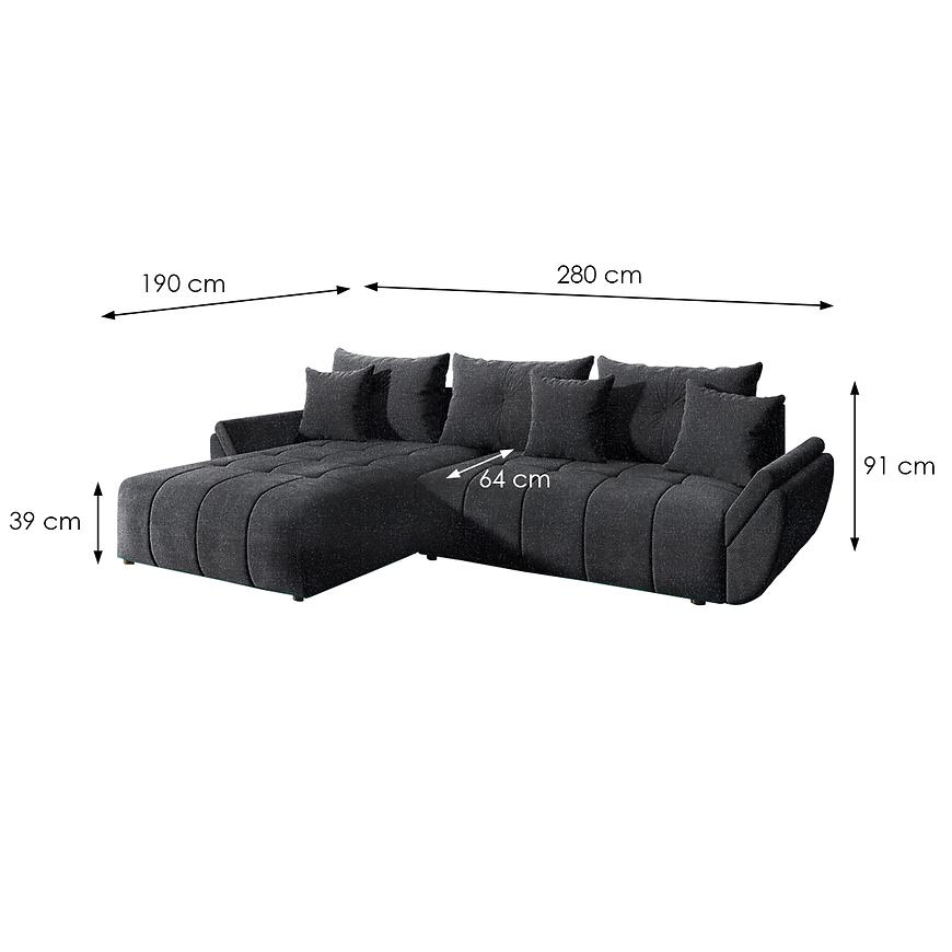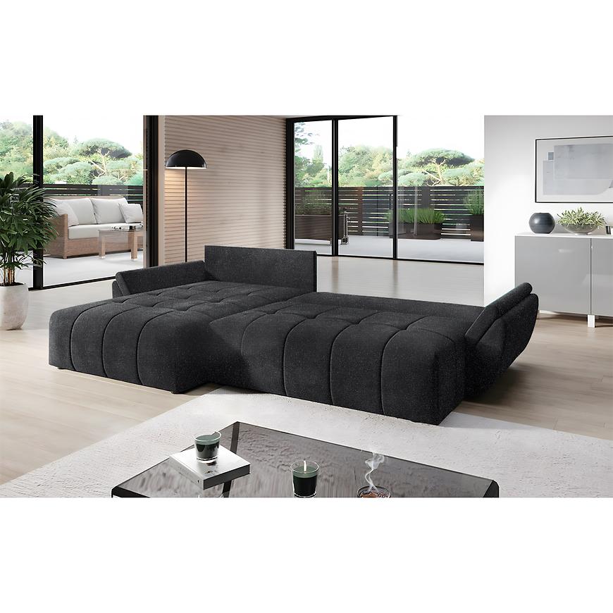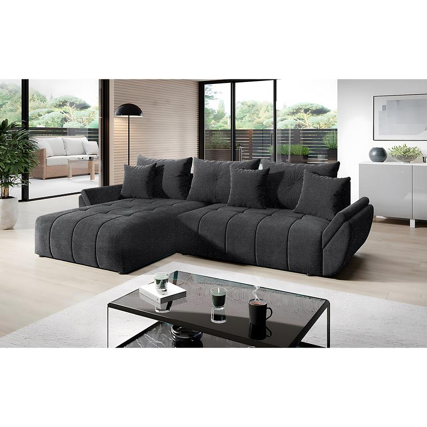 Narożnik z funkcją spania Bono oraz pojemnikiem na pościel. Narożnik w komplecie posiada poduszki oparciowe. Model wykonany w tkaninie New Doha 22 w kolorze szarym. W siedzisku mebla zastosowano sprężyny faliste. Narożnik uniwersalny prawy/lewy, wyboru strony narożnika dokujnemy przy montażu. Sposób rozkładania topopularny system DL. Po rozłożeniu to okazjonalne miejsce do spania o wymiarach 149x230 cm. Jako element dekoracyjny zastosowano przeszycia na siedzisku naroznika. W narożniku zostosowano nóżki w kolorze czarnym.