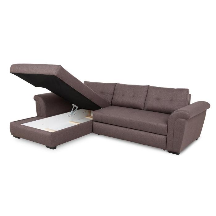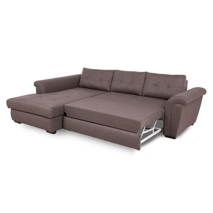 Sposób rozkładania to popularny Delfin, pomaga szybko i bezproblemowo przekształcić narożnik w przestronne łóżko. Rozkładanie typu Delfin jest najczęściej spotykane w narożnikach i kanapach, to bardzo prosty system rozkładania - spod siedziska wysuwamy wózek umieszczony na kółkach, a następnie podciągamy leżący element uzupełniający powierzchnię spania. Po rozłożeniu otrzymujemy powierzchnia spania o wymiarach 122 x 201 cm. Pościel można schować do pojemnika znajdującego się w otomanie, zapewniając ład i porządek w pomieszczeniu. Pojemnik na pościel wykonany jest z laminowanej płyty MDF.