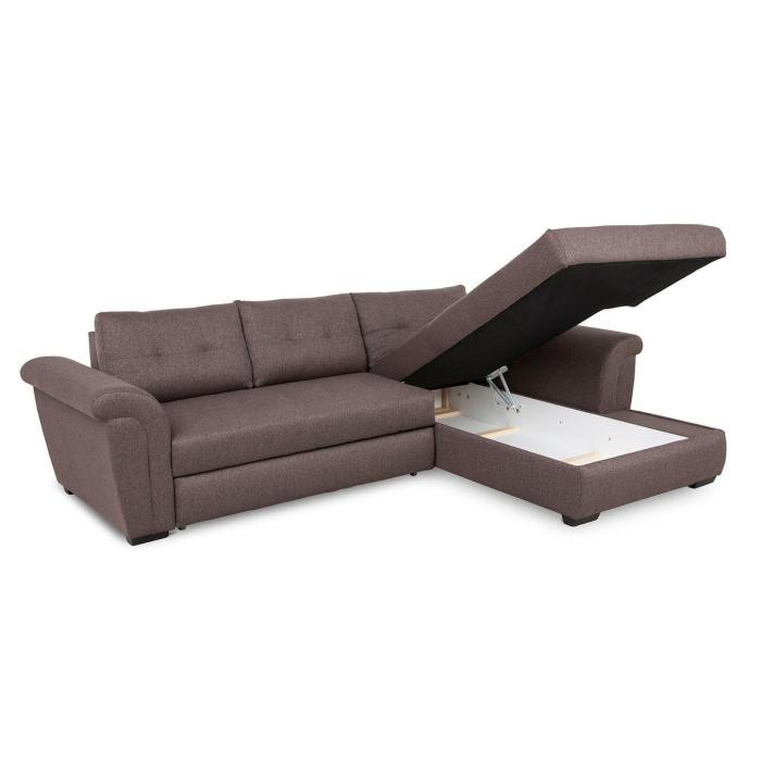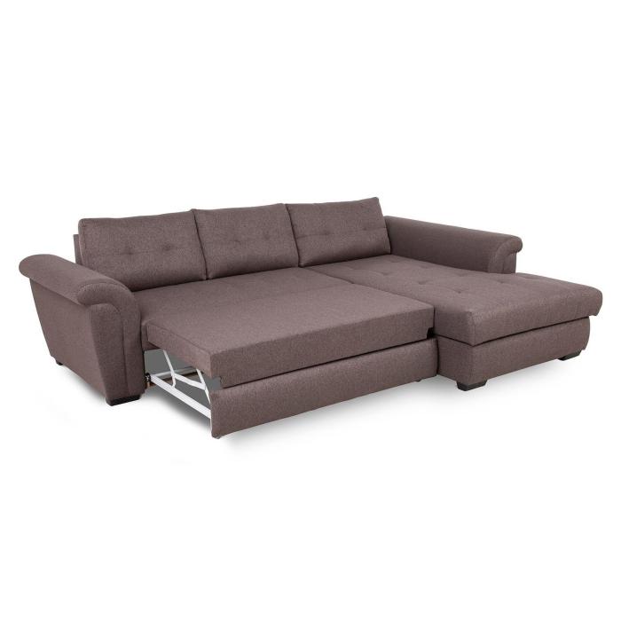 Sposób rozkładania to popularny Delfin, pomaga szybko i bezproblemowo przekształcić narożnik w przestronne łóżko. Rozkładanie typu Delfin jest najczęściej spotykane w narożnikach i kanapach, to bardzo prosty system rozkładania - spod siedziska wysuwamy wózek umieszczony na kółkach, a następnie podciągamy leżący element uzupełniający powierzchnię spania. Po rozłożeniu otrzymujemy powierzchnia spania o wymiarach 122 x 201 cm. Pościel można schować do pojemnika znajdującego się w otomanie, zapewniając ład i porządek w pomieszczeniu. Pojemnik na pościel wykonany jest z laminowanej płyty MDF.