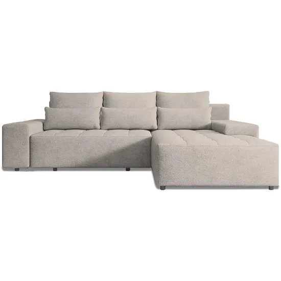 Wbudowany schowek na pościel to praktyczny element, który podnosi funkcjonalność narożnika Canada Perfect Harmony. Jeden pojemnik na pościel pozwala na wygodne przechowywanie kołder, poduszek lub dodatkowych tekstyliów, pomagając utrzymać porządek w salonie. Tapicerka wykonana z trwałej tkaniny jest przyjemna w dotyku i dobrze sprawdza się w codziennym użytkowaniu, zachowując estetyczny wygląd przez długi czas. Dzięki neutralnemu charakterowi tkaniny narożnik łatwo dopasować do różnych stylów aranżacyjnych.
