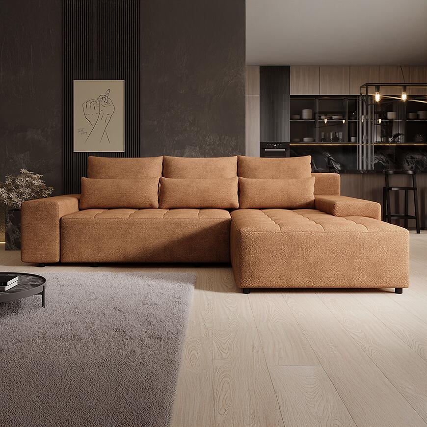 Wbudowany schowek na pościel to praktyczny element, który podnosi funkcjonalność narożnika Canada Perfect Harmony. Jeden pojemnik na pościel pozwala na wygodne przechowywanie kołder, poduszek lub dodatkowych tekstyliów, pomagając utrzymać porządek w salonie. Tapicerka wykonana z trwałej tkaniny jest przyjemna w dotyku i dobrze sprawdza się w codziennym użytkowaniu, zachowując estetyczny wygląd przez długi czas. Dzięki neutralnemu charakterowi tkaniny narożnik łatwo dopasować do różnych stylów aranżacyjnych.