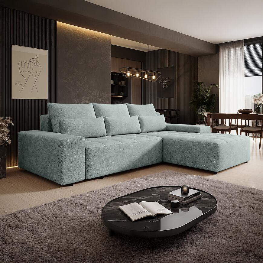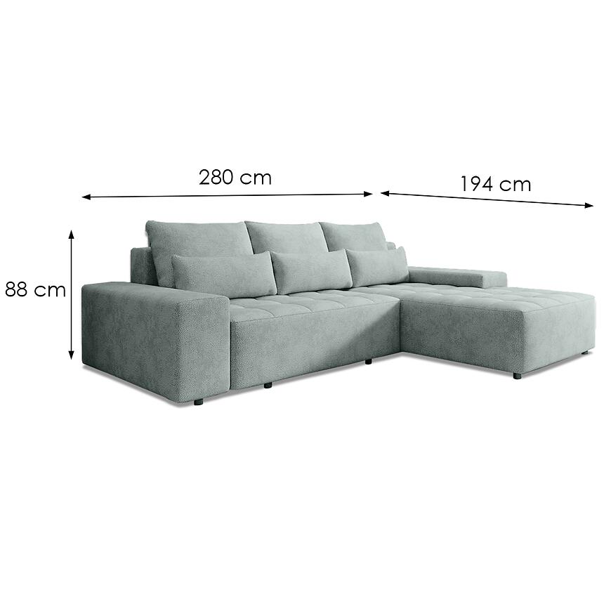 Narożnik z funkcją spania Canada Perfect Harmony w kolorze turkusowym to propozycja dla osób, które szukają dużego, wygodnego i estetycznego narożnika tapicerowanego do codziennego użytkowania. Model o wymiarach 280 cm szerokości, 194 cm głębokości i 88 cm wysokości idealnie wpisuje się w kategorię narożników średnich, oferując optymalny balans pomiędzy przestrzenią wypoczynkową a ergonomią wnętrza. Dzięki uniwersalnej orientacji narożnik można dopasować do różnych układów pomieszczeń, co czyni go praktycznym wyborem zarówno do przestronnych salonów, jak i mieszkań w zabudowie blokowej.