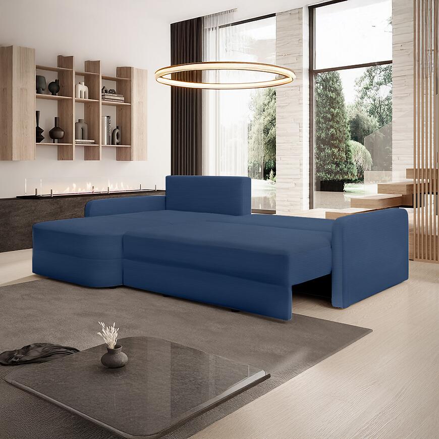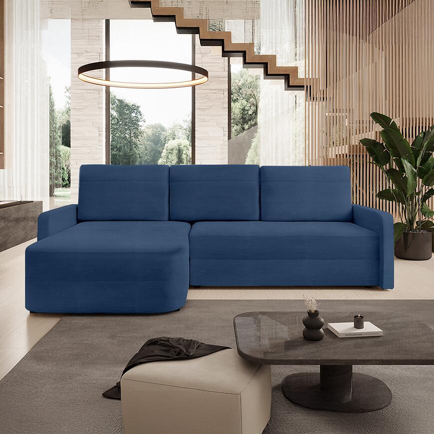 Narożnik Cloe Ontario 26 łączy elegancki granatowy kolor z praktycznymi rozwiązaniami, oferując wygodne miejsce do siedzenia i komfortową powierzchnię do spania. Uniwersalna orientacja w kształcie litery L pozwala dopasować narożnik do dowolnej strony pomieszczenia.