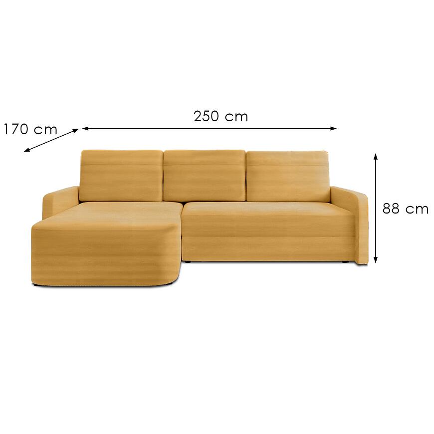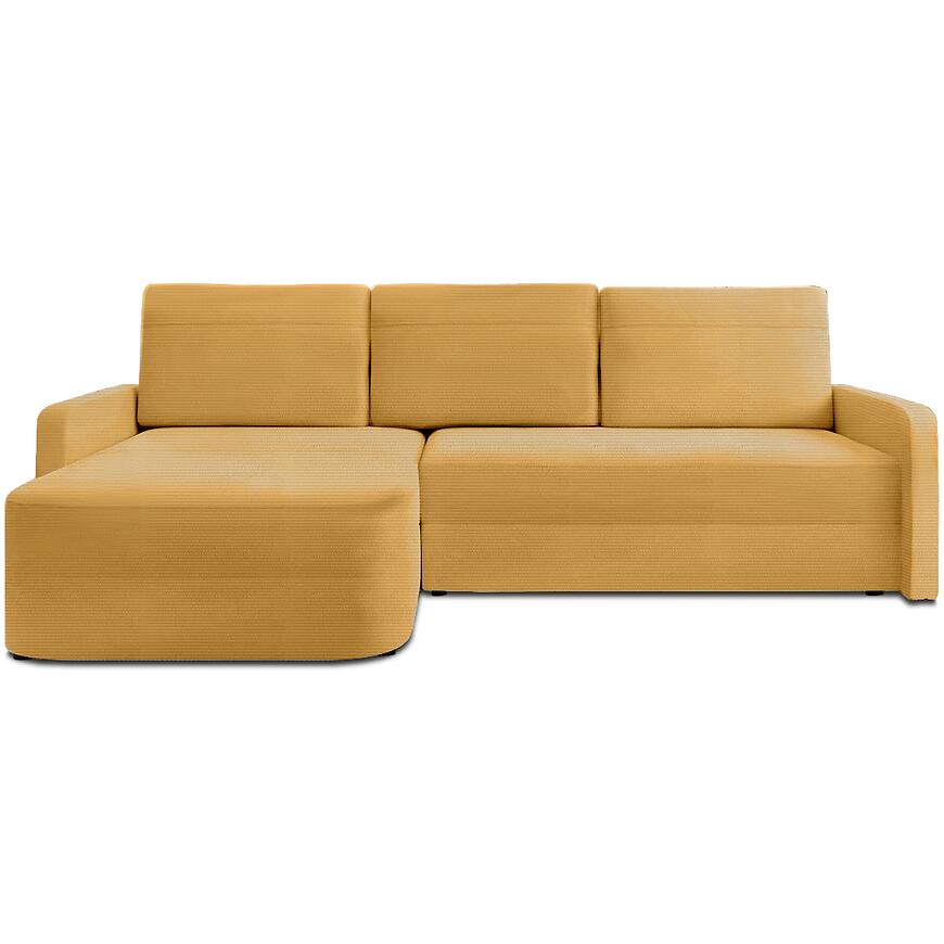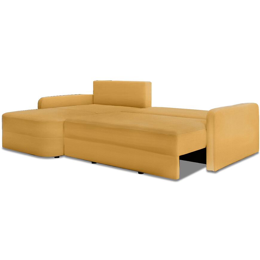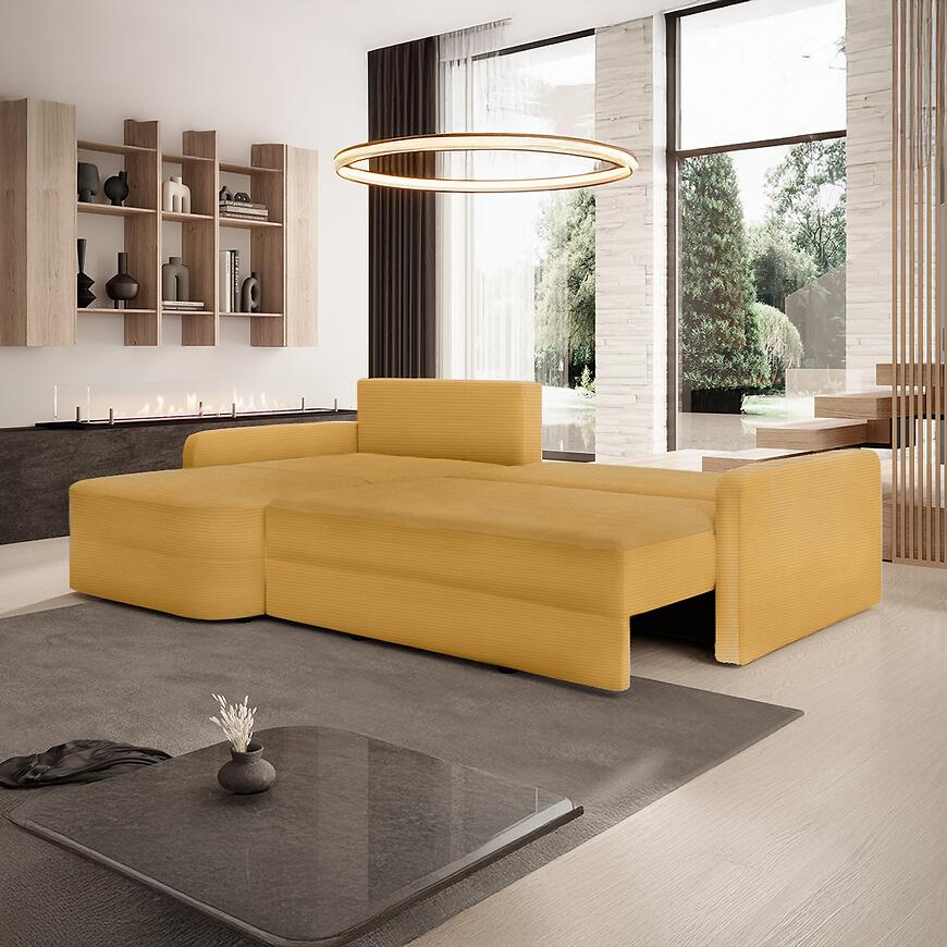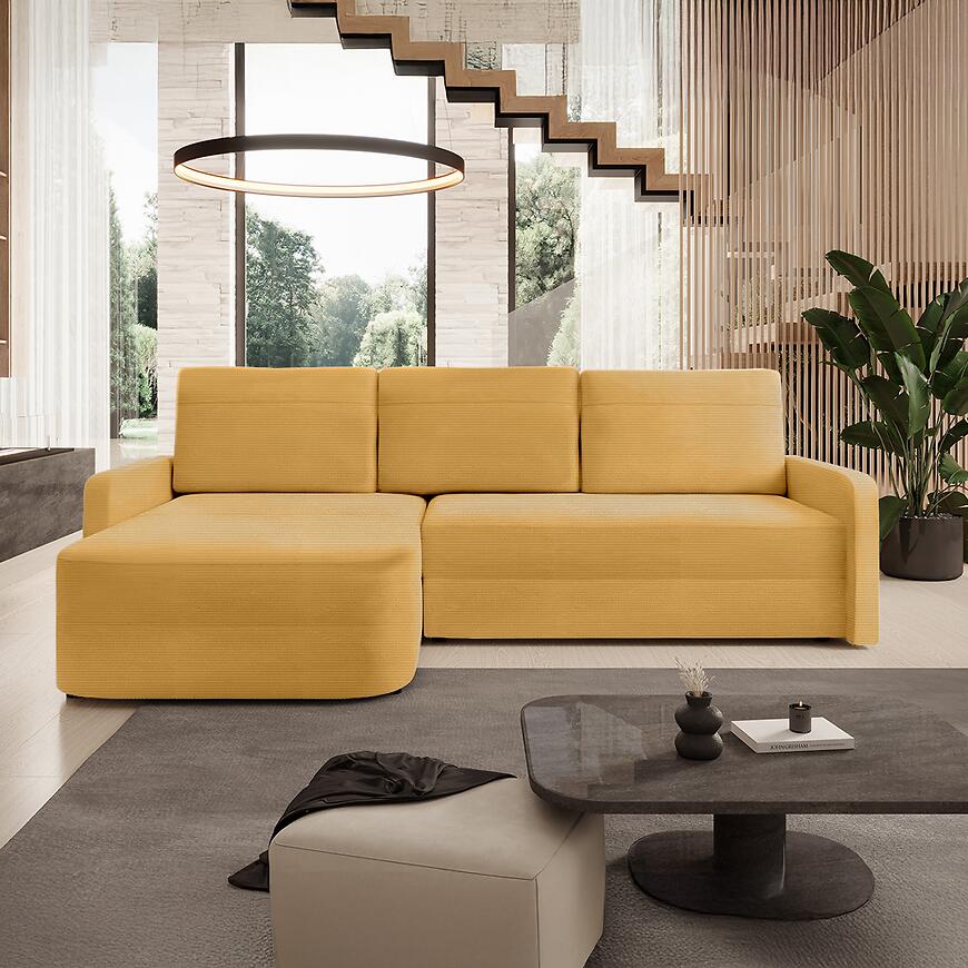 Narożnik Cloe Ontario 32 w miodowym kolorze łączy elegancję, komfort i funkcjonalność. Funkcja spania DL, pojemnik na pościel oraz trwałe wypełnienie sprężynowo-piankowe sprawiają, że mebel jest praktyczny i wygodny w codziennym użytkowaniu. Uniwersalna orientacja w kształcie litery L oraz poduszki zapinane na zamek dodają mu estetyki i użyteczności.