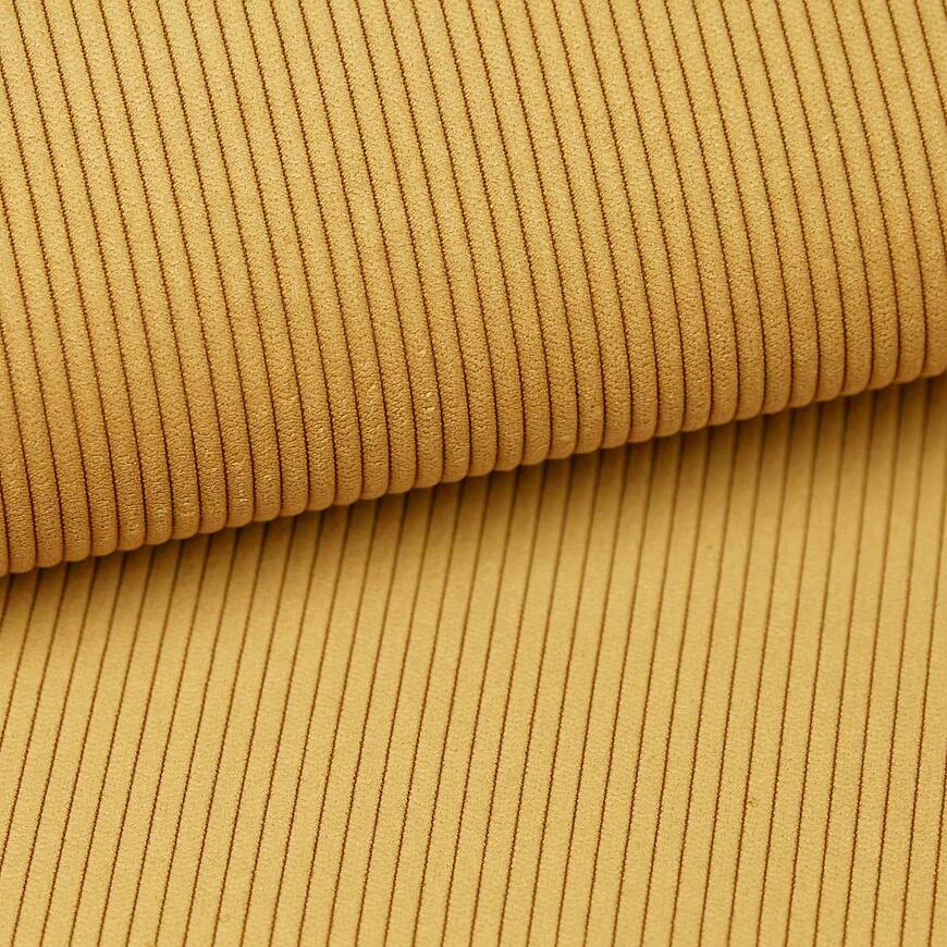 Narożnik obity jest tkaniną w miodowym kolorze, która wprowadza do wnętrza ciepły, przytulny klimat. Poduszki zapinane na zamek ułatwiają utrzymanie czystości i dodają narożnikowi eleganckiego wykończenia. Prosta forma bez regulowanych zagłówków, podłokietników i oparcia podkreśla klasyczny charakter mebla.