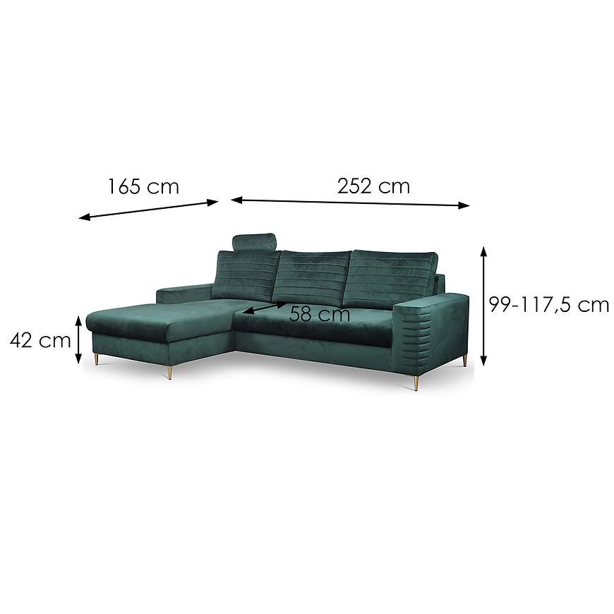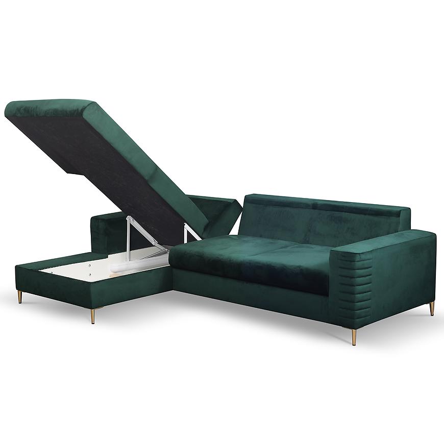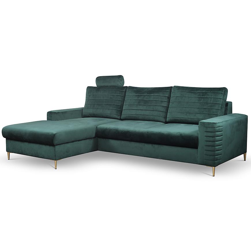Złote nogi dodają narożnikowi elegancji i doskonale komponują się z różnorodnymi aranżacjami wnętrz. W komplecie z narożnikiem znajdują się poduszki, które nie tylko dodają estetyki, ale również podnoszą komfort użytkowania.