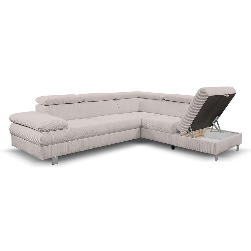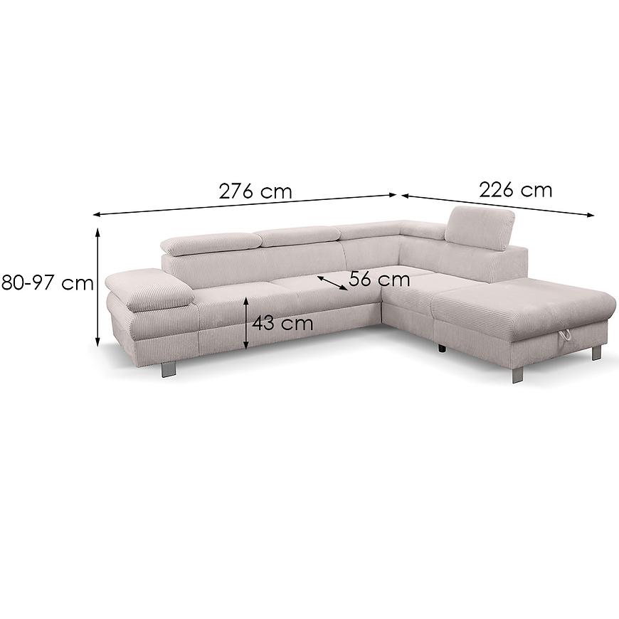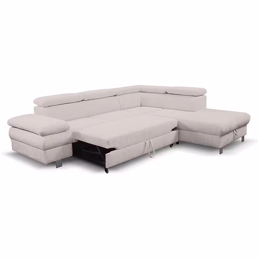 Narożnik Conti posiada także funkcję spania, sposób rozkładania - delfin. Po rozłożeniu to okazjonalne miejsce do spania. Dodatkowym atutem jest schowek na pościel, który umożliwia przechowywanie pościeli czy dodatkowych poduszek w dyskretny sposób, oszczędzając przestrzeń w pomieszczeniu. Regulowany zagłówek oraz regulowane podłokietniki to kolejne elementy, które podnoszą komfort użytkowania tego narożnika. Dzięki nim można dostosować mebel do własnych preferencji i potrzeb, zapewniając sobie idealne wsparcie podczas wypoczynku. Narożnik Conti posiada także solidne nóżki w kolorze satyna, które nadają mu elegancki wygląd i stabilność.