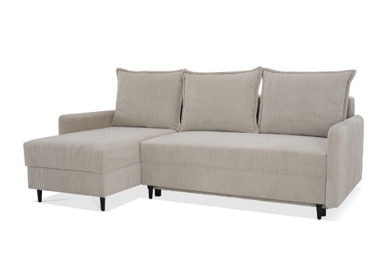 Praktyczność narożnika Cord podkreślają dwa pojemniki na pościel, umieszczone pod siedziskiem i w otomanie. To rozwiązanie pozwala na wygodne przechowywanie kołder, poduszek czy koców, co jest szczególnie przydatne w mniejszych mieszkaniach, gdzie każdy centymetr przestrzeni jest na wagę złota.