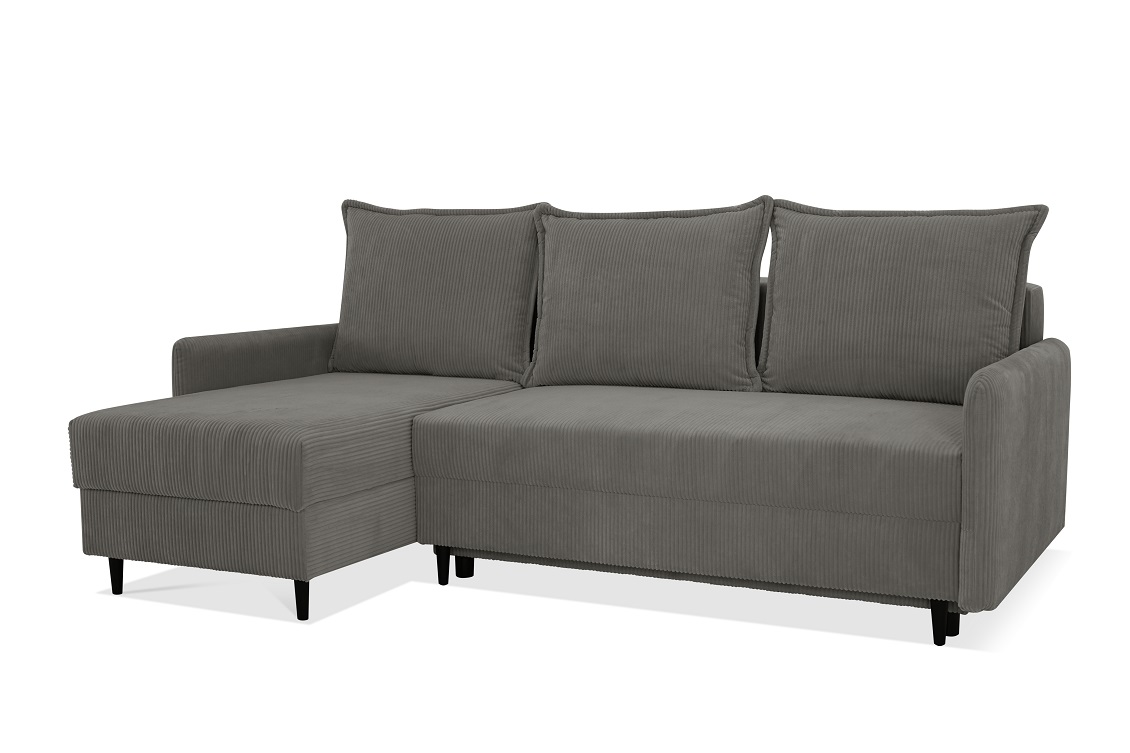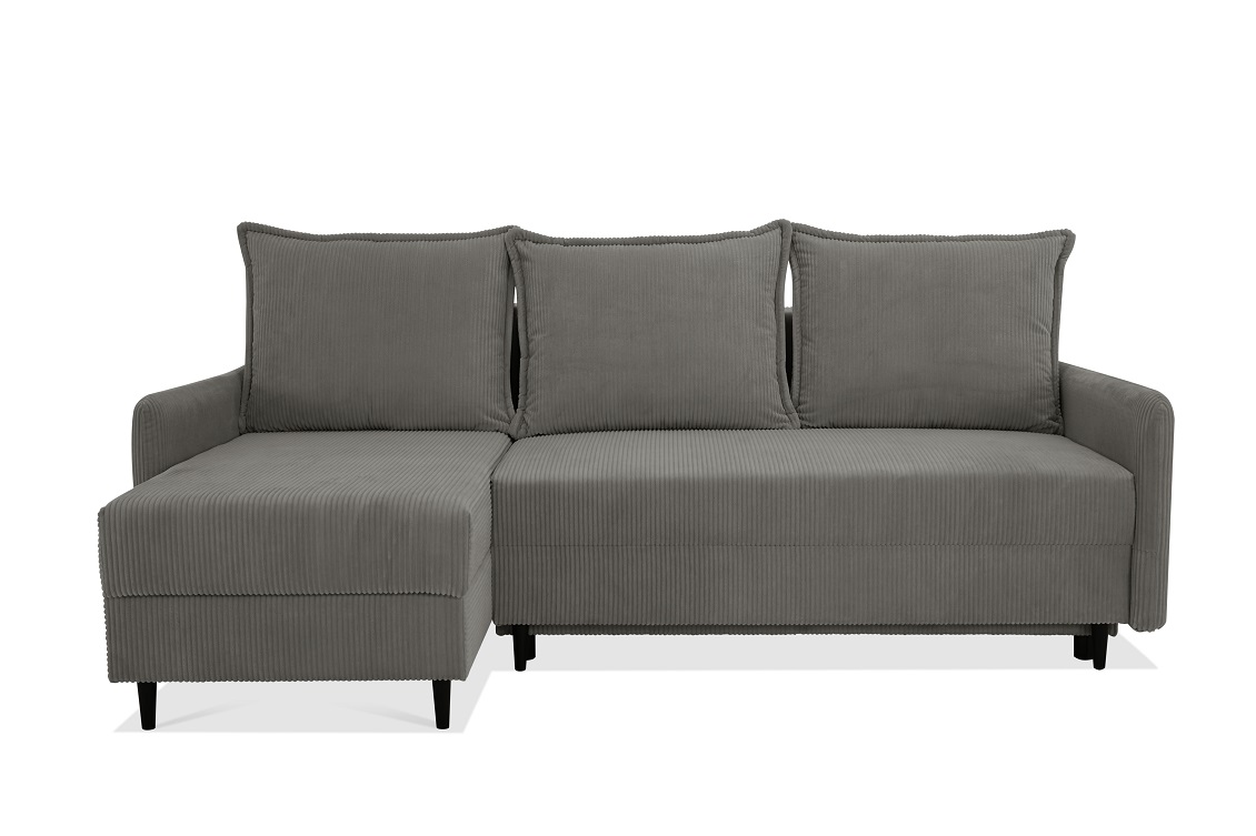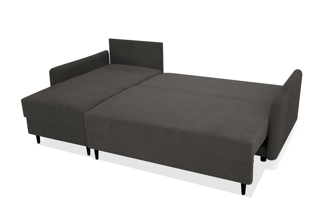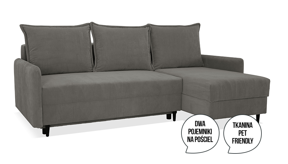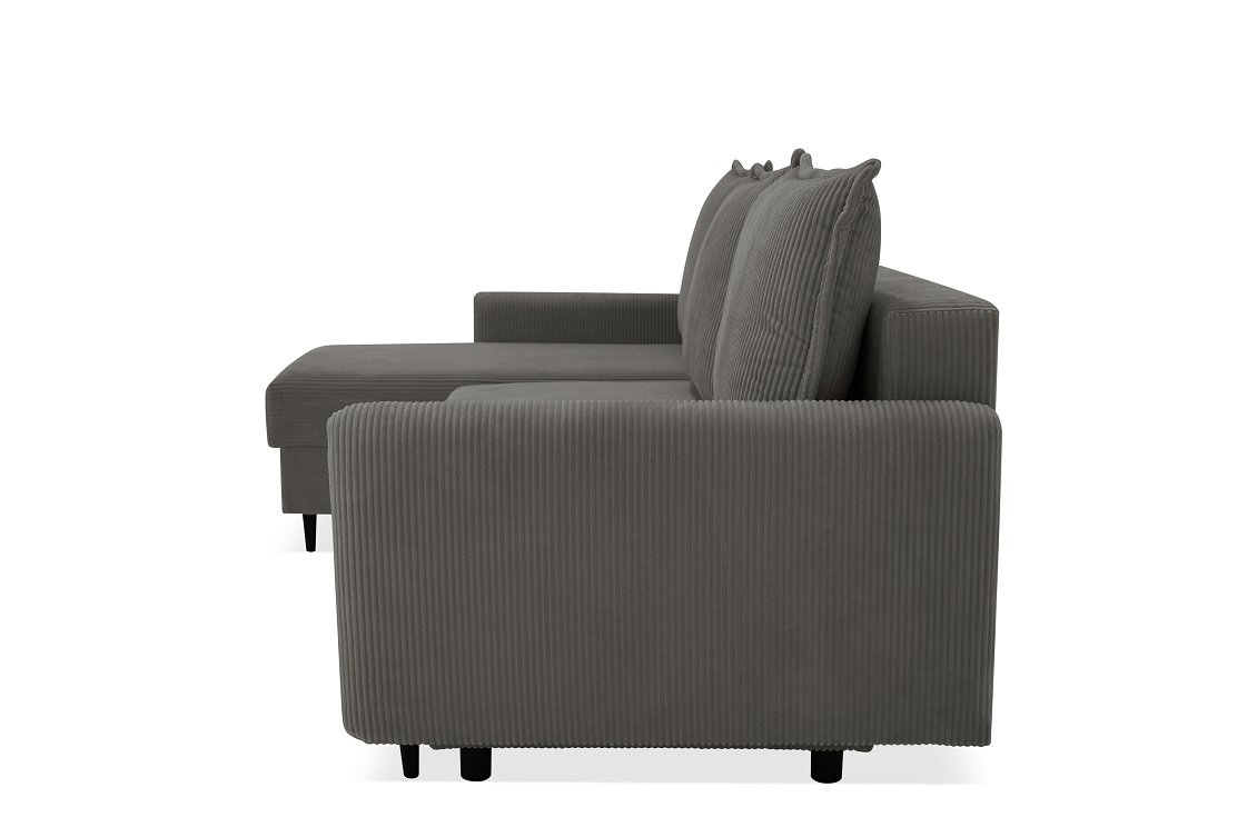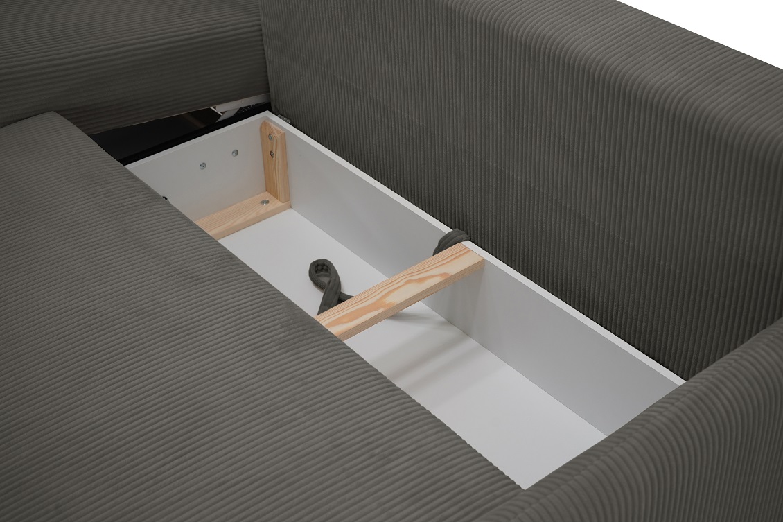 Praktyczność narożnika Cord podkreślają dwa pojemniki na pościel, umieszczone pod siedziskiem i w otomanie. To rozwiązanie pozwala na wygodne przechowywanie kołder, poduszek czy koców, co jest szczególnie przydatne w mniejszych mieszkaniach, gdzie każdy centymetr przestrzeni jest na wagę złota.