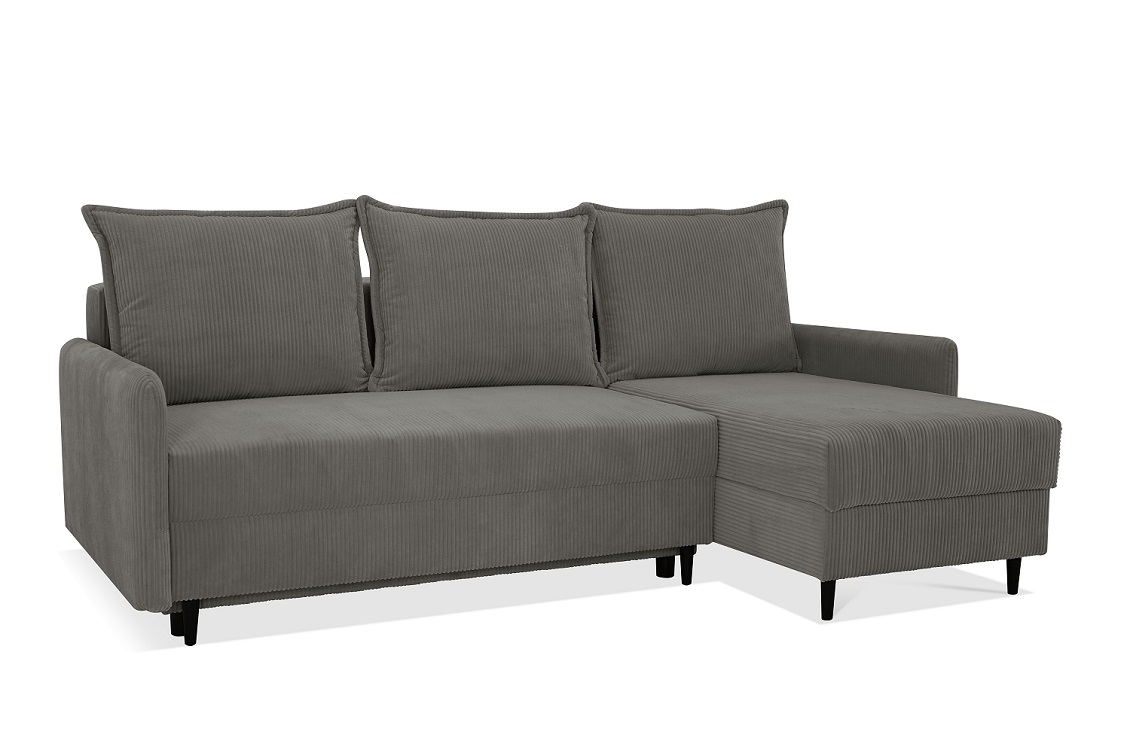 Narożnik Cord jest uniwersalny i dostępny w opcji prawostronnej lub lewostronnej, co pozwala na łatwe dopasowanie go do każdej przestrzeni. Stożkowe, drewniane nogi w kolorze czarnym podkreślają nowoczesny design mebla i dodają mu lekkości, jednocześnie zapewniając stabilność i trwałość.
