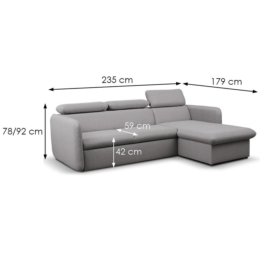 Zarówno wysokość (78/92 cm), szerokość (235 cm), jak i głębokość (179 cm) tego narożnika są starannie dostosowane, aby zapewnić optymalny komfort użytkowania. Wysokość do siedziska wynosząca 42 cm i głębokość siedziska wynosząca 59 cm gwarantują przyjemne doznania podczas każdego odpoczynku.