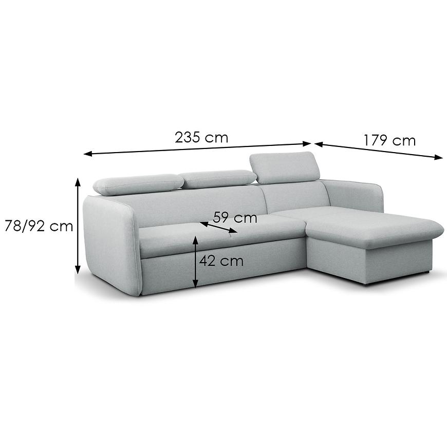 Zarówno wysokość (78/92 cm), szerokość (235 cm), jak i głębokość (179 cm) tego narożnika są starannie dostosowane, aby zapewnić optymalny komfort użytkowania. Wysokość do siedziska wynosząca 42 cm i głębokość siedziska wynosząca 59 cm gwarantują przyjemne doznania podczas każdego odpoczynku.