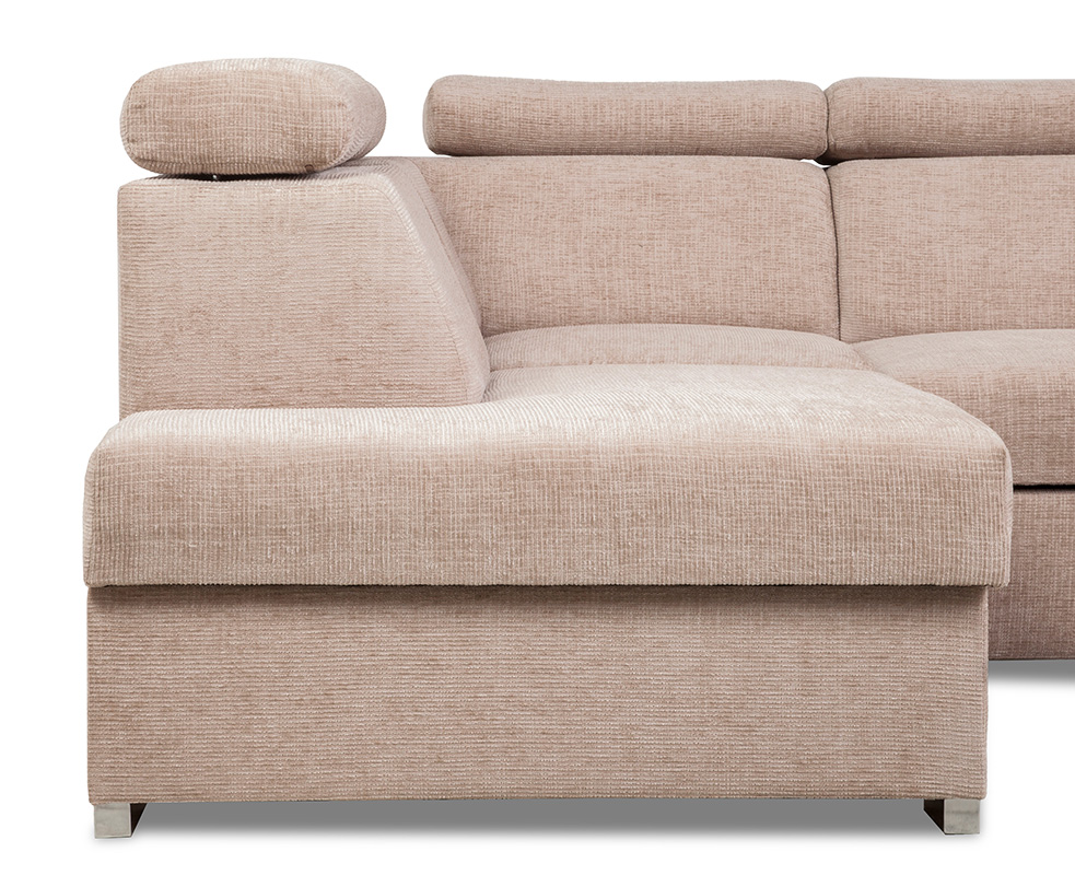 Narożnik Emporio wyróżnia się nowoczesnym designem i wysoką jakością wykonania. Tapicerka w tkaninie Sierra 744 w eleganckim beżowym kolorze nadaje meblowi stylowy wygląd, który doskonale wkomponuje się w różnorodne aranżacje wnętrz. Chromowane metalowe nóżki z przodu dodają narożnikowi lekkości i elegancji, a tapicerowane tkaniną plecy pozwalają na swobodne ustawienie mebla w dowolnym miejscu pokoju.