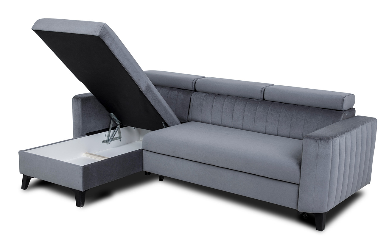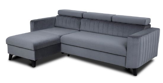 Duży narożnik Fenix to elegancja, wygoda i funkcjonalność. Narożnik dostępny w konfiguracji uniwersalnej (prawe/lewej). Narożnik rozkładany to mebel idealny dla rodzin, które cenią sobie wspólny wypoczynek na sofie. Nowoczesny narożnik z funkcją spania wyposażony w sprężyny faliste oraz wygodne oparcie zapewni wysoki komfort nawet najbardziej wymagającym miłośnikom wielogodzinnych drzemek. Regulowane zagłówki to dodatkowy komfort podczas wypoczynku lub oglądania telewizji. Jako element dekoracyjny zostały zastosowane ozdobne przeszycia i wciągi na oparciu i bokach narożnika.