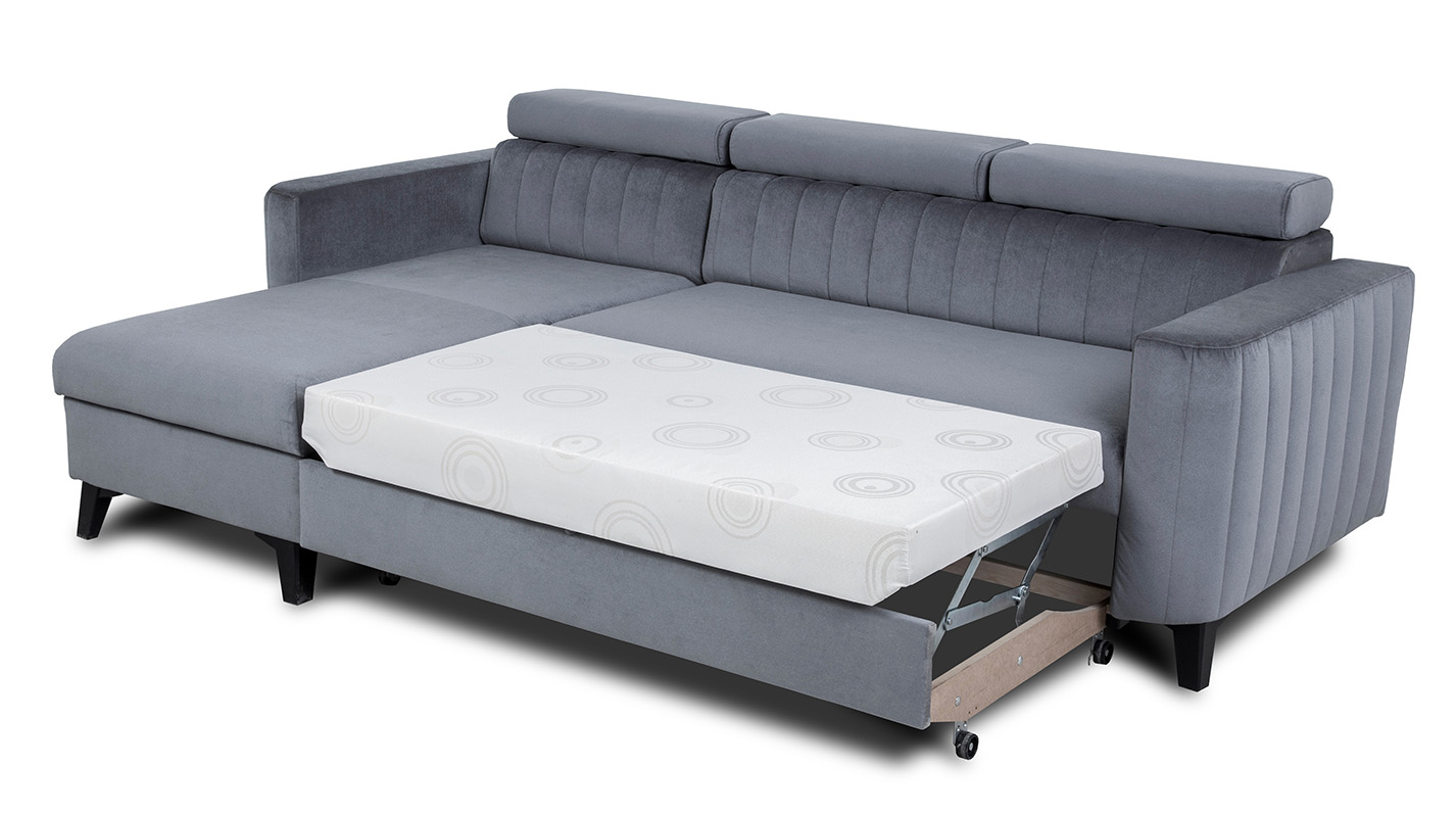 Sposób rozkładania Delfin pomaga szybko i bezproblemowo przekształcić kanapę w przestronne łóżko. Rozkładanie typu Delfin jest najczęściej spotykane w narożnikach - spod siedziska wysuwamy szufladę, a następnie podciągamy leżący element uzupełniający powierzchnię spania. Po rozłożeniu powierzchnia spania to 125x195 cm, a pościel można schować do pojemnika umieszczonego pod siedziskiem zapewniając ład i porządek w pomieszczeniu.