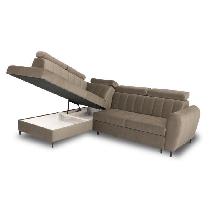 Sposób rozkładania to popularny Delfin, pomaga szybko i bezproblemowo przekształcić narożnik w przestronne łóżko. Rozkładanie typu Delfin jest najczęściej spotykane w narożnikach i kanapach, to bardzo prosty system rozkładania - spod siedziska wysuwamy wózek umieszczony na kółkach, a następnie podciągamy leżący element uzupełniający powierzchnię spania. Po rozłożeniu otrzymujemy powierzchnia spania o wymiarach 128x200 cm. Pościel można schować do pojemnika znajdującego się w otomanie, zapewniając ład i porządek w pomieszczeniu.