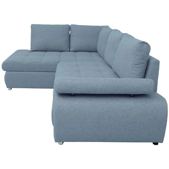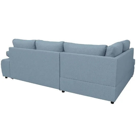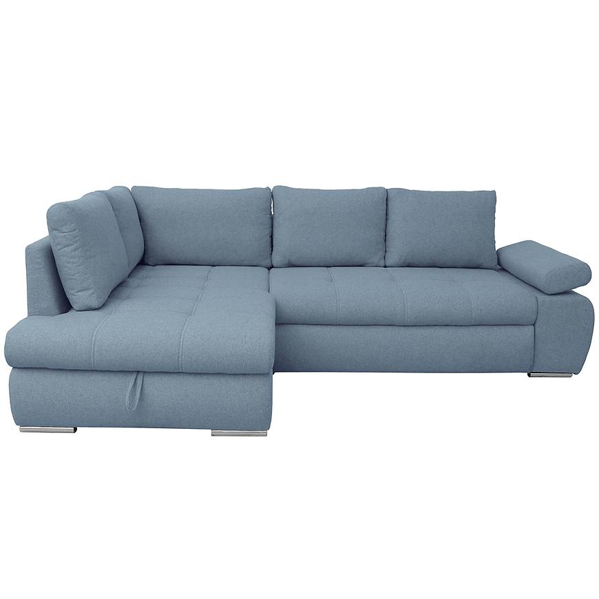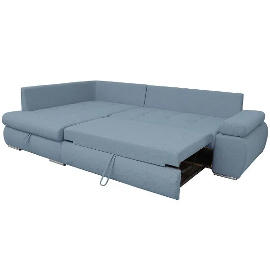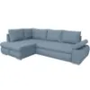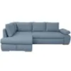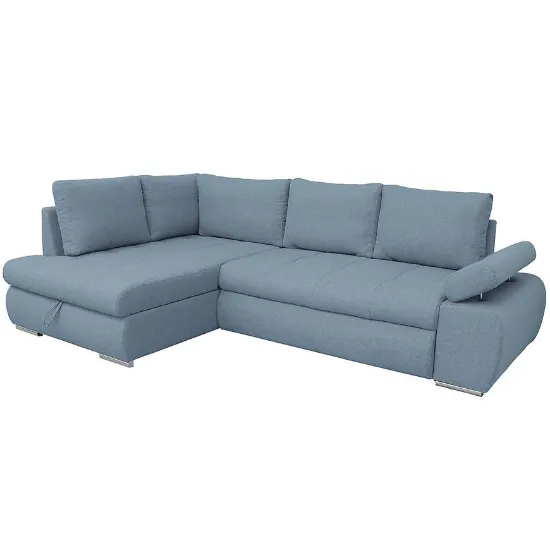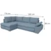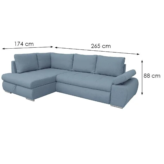 Narożnik z funkcją spania Haris oraz pojemnikiem na pościel. Narożnik w komplecie posiada pięć dużych poduszek oparciowych. Model wykonany w tkaninie Lumos 83 w kolorze niebieskim. W siedzisku zastosowano sprężyny faliste oraz piankę PU. Narożnik dostępny jest w konfiguracji prawej lub lewej. Sposób rozkładania to popularny system delfin. Po rozłożeniu to okazjonalne miejsce do spania o wymiarach 160x220 cm. Jako element dekoracyjny zastosowano ozdobne pikowania na siedzisku mebla oraz na poduszkach oparciowych. Narożnik posiada regulowane podłokietniki. W narożniku zastosowano nóżki w kolorze srebrnym.