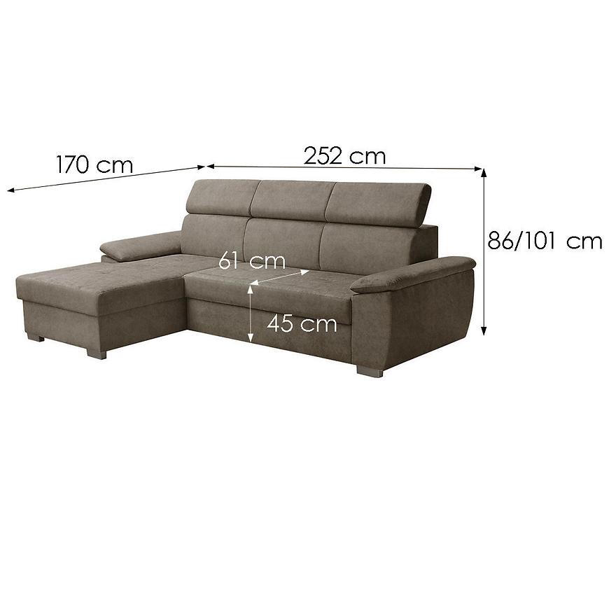 Narożnik wyposażony jest w stałe poduchy oparciowe z regulowanymi zagłówkami oraz podłokietnikami, co pozwala na dostosowanie pozycji do indywidualnych potrzeb użytkownika. Głębokość siedziska wynosi 61 cm, a wysokość do siedziska to 45 cm, co zapewnia wygodne wsparcie podczas codziennego odpoczynku.