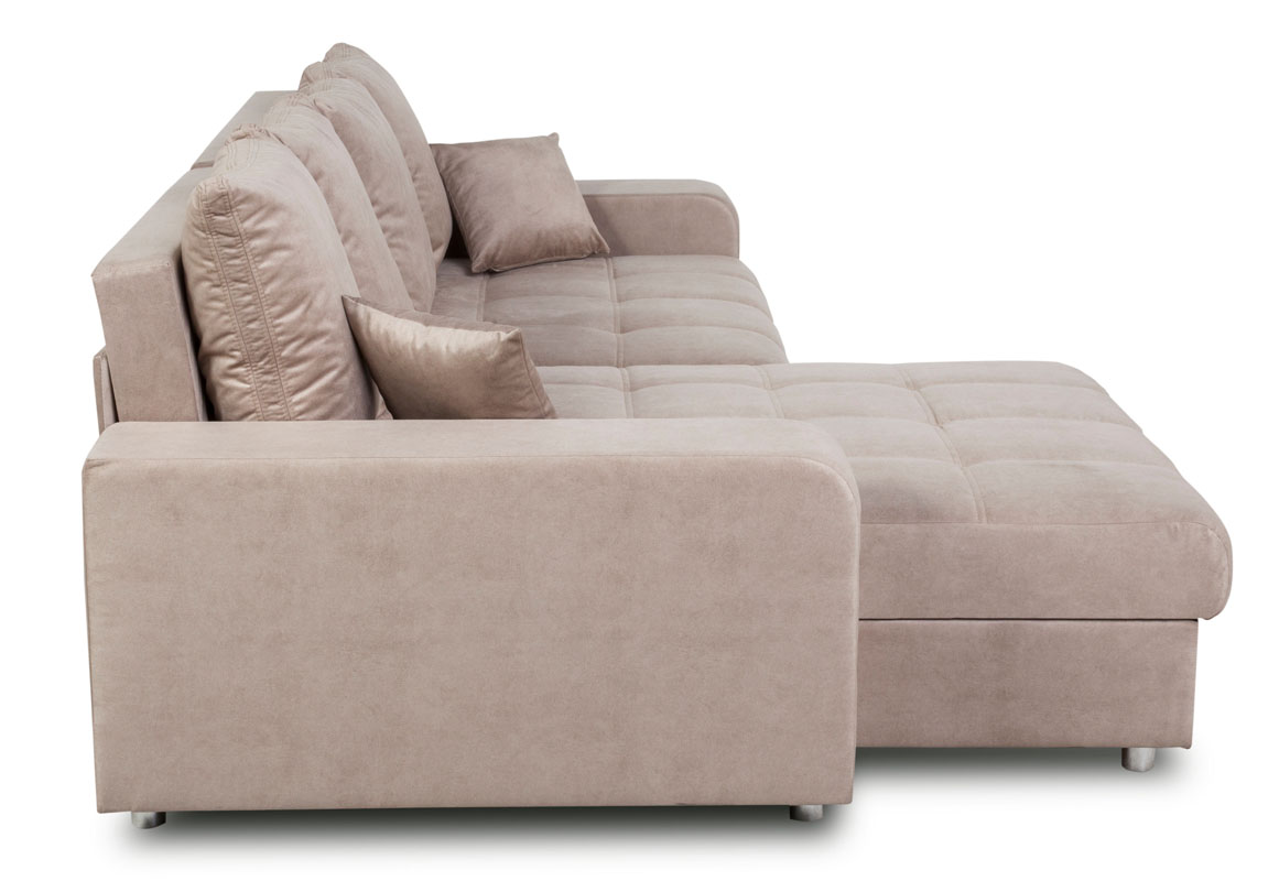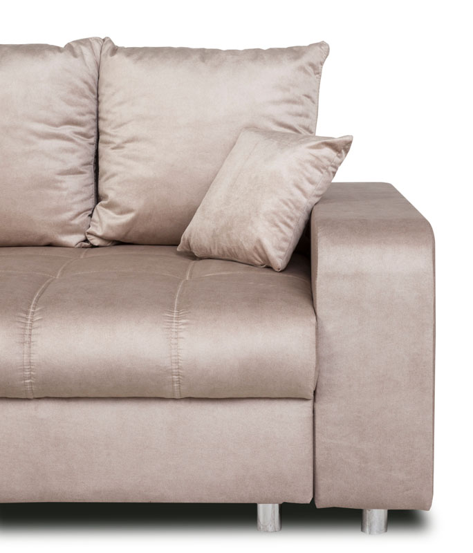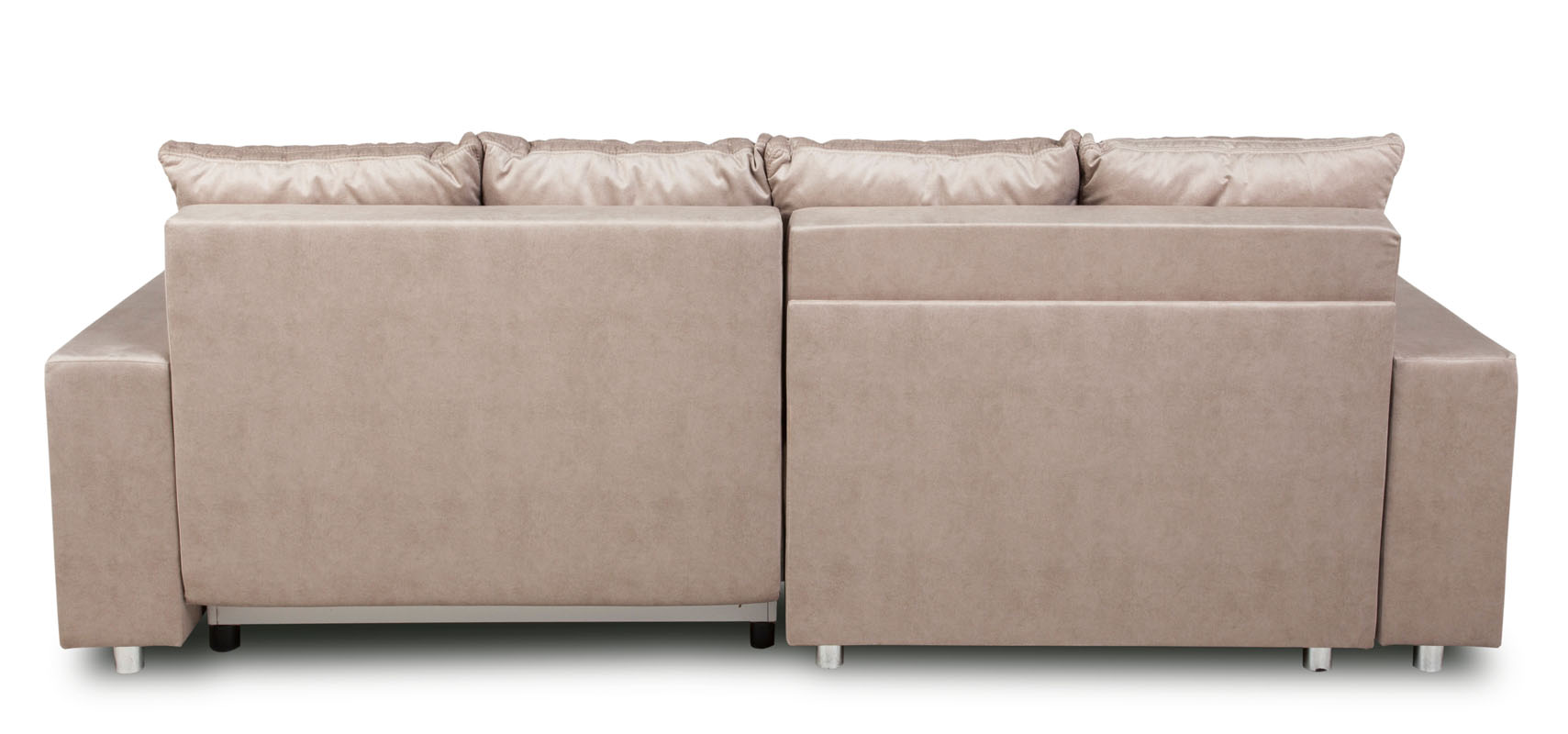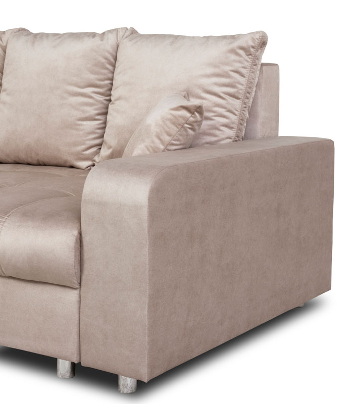 Narożnik Kronos wyróżnia się także praktycznymi detalami, takimi jak dwa pojemniki na pościel, które umożliwiają sprytne przechowywanie dodatkowego wyposażenia. Nóżki wykonane z tworzywa sztucznego w eleganckim kolorze srebrnym dodają narożnikowi lekkości i nowoczesnego charakteru.