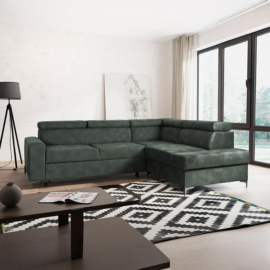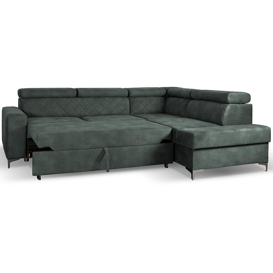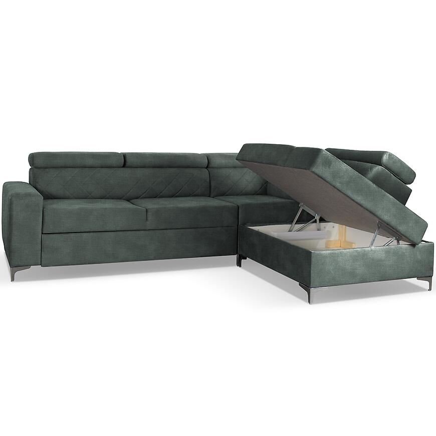 Narożnik Logan Wind 75 prawostronny to średniej wielkości narożnik w kształcie litery L o wymiarach 268×200 cm i wysokości 86/106 cm, tapicerowany zieloną tkaniną. Siedzisko wypełnione sprężyną falistą zapewnia wygodę użytkowania. Posiada funkcję spania typu delfin z powierzchnią spania 121×200 cm oraz jeden pojemnik na pościel. Wyposażony jest w regulowane zagłówki i chromowane nogi. Produkt waży 164 kg, nie zawiera poduszek ani pufy i wymaga montażu, łącząc funkcjonalność z komfortem codziennego użytkowania.