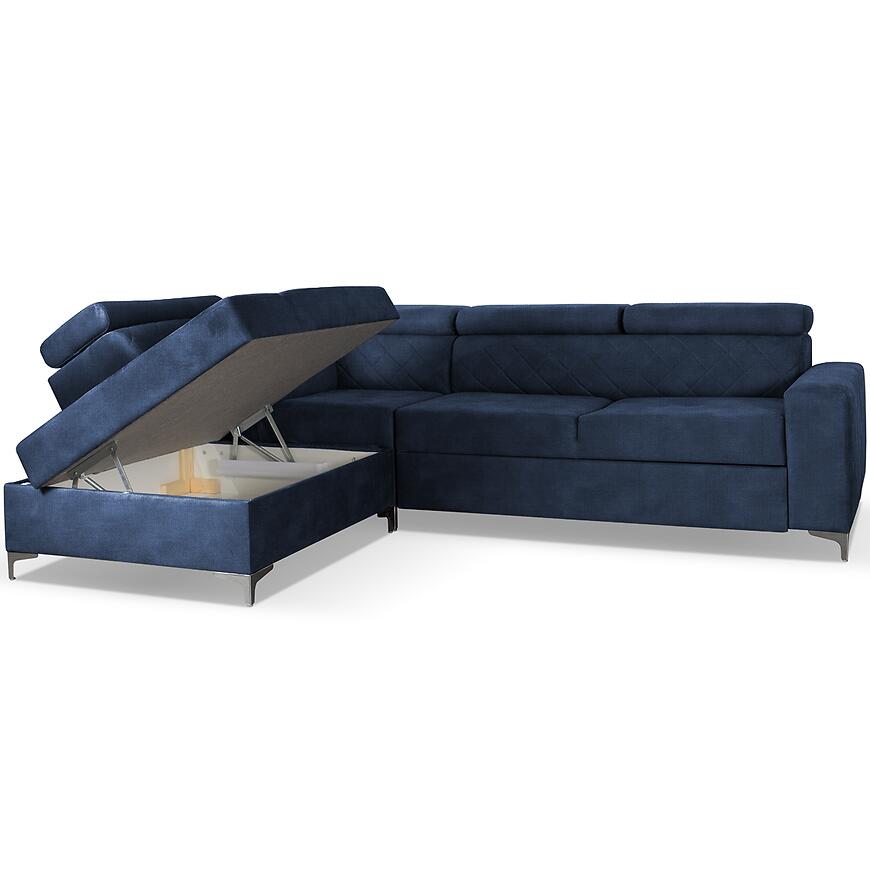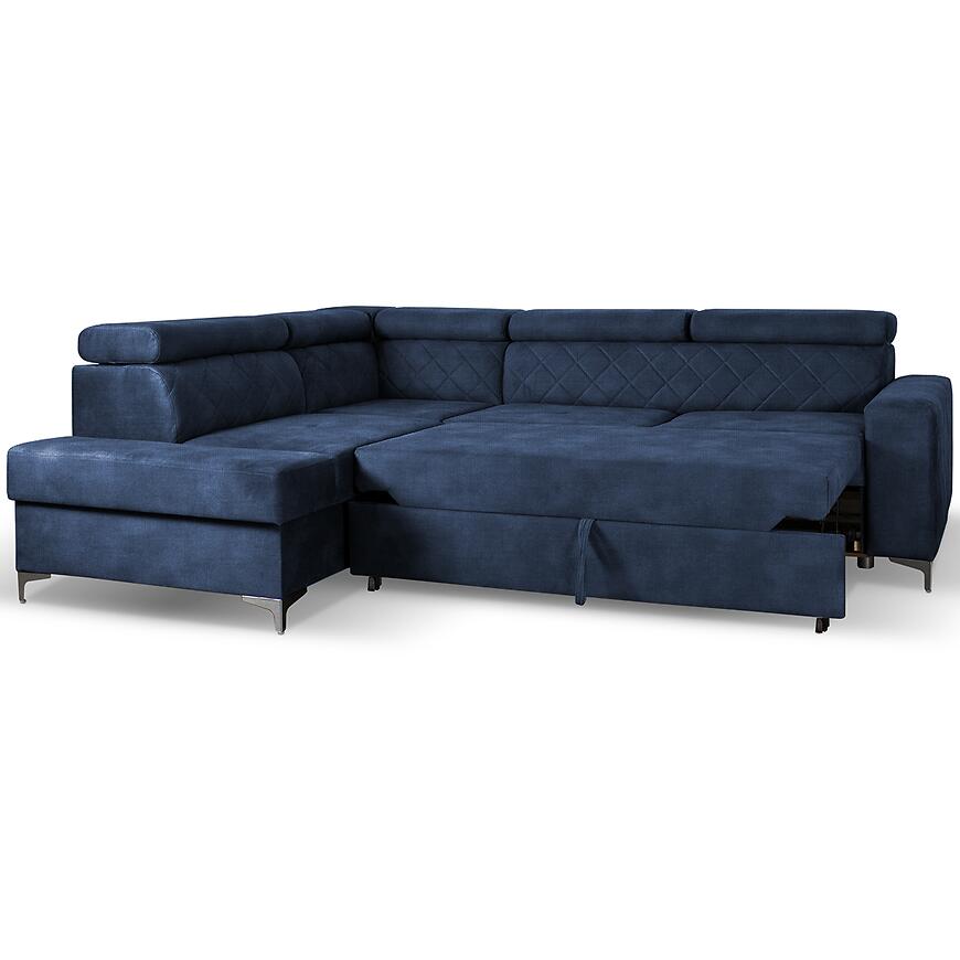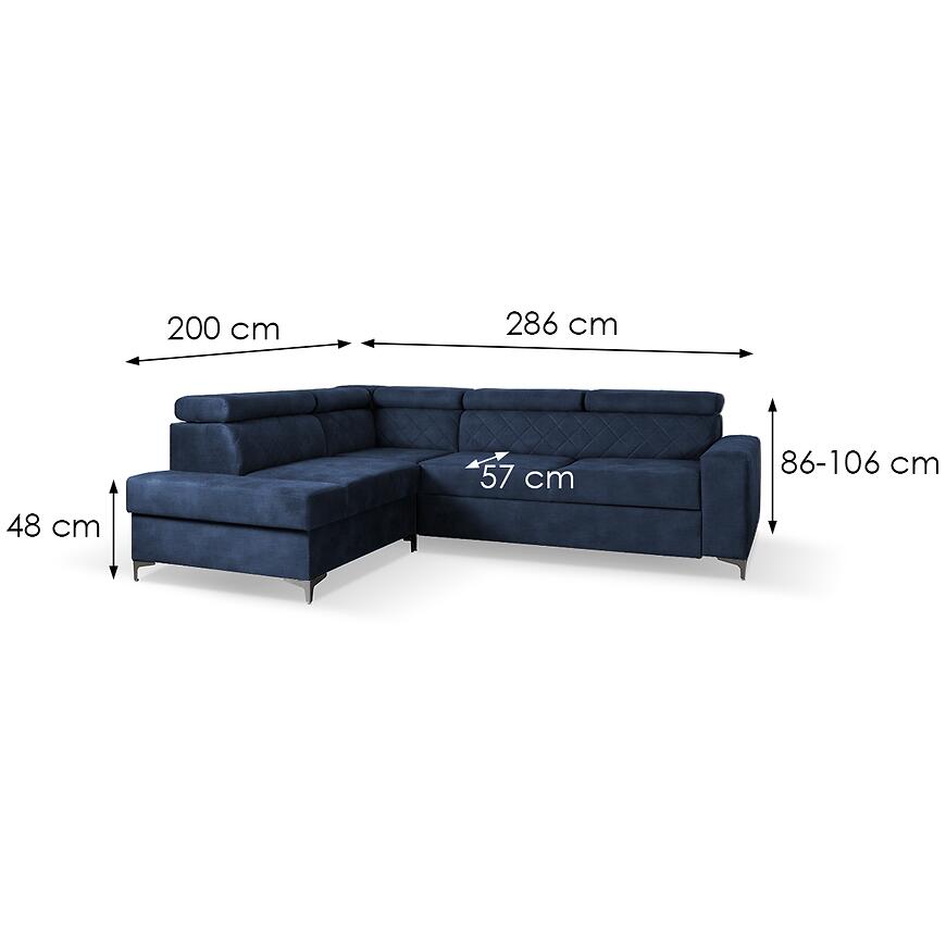 Narożnik Logan Wind 77 lewostronny to średniej wielkości narożnik w kształcie litery L o wymiarach 268×200 cm i wysokości 86/106 cm, tapicerowany niebieską tkaniną. Siedzisko wypełnione sprężyną falistą zapewnia wygodę codziennego użytkowania. Posiada funkcję spania typu delfin z powierzchnią spania 121×200 cm oraz jeden pojemnik na pościel. Wyposażony jest w regulowane zagłówki i chromowane nogi. Produkt waży 164 kg, nie zawiera poduszek ani pufy i wymaga montażu, łącząc funkcjonalność z komfortem w codziennym użytkowaniu.