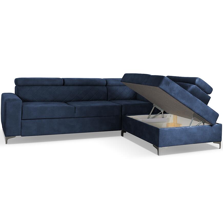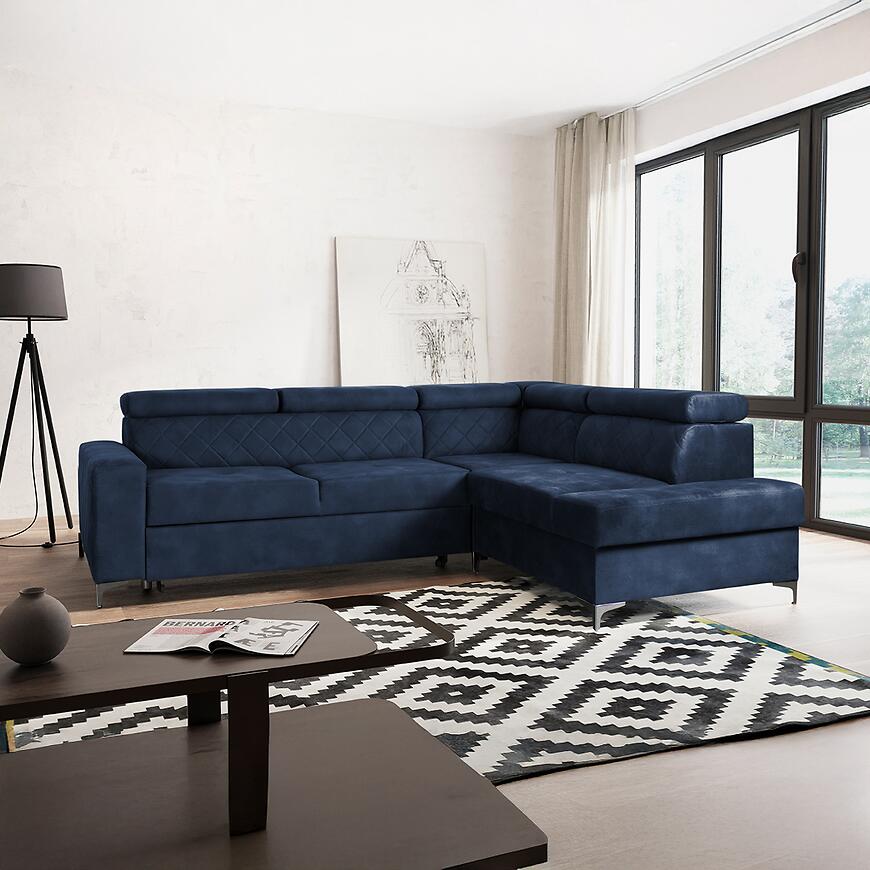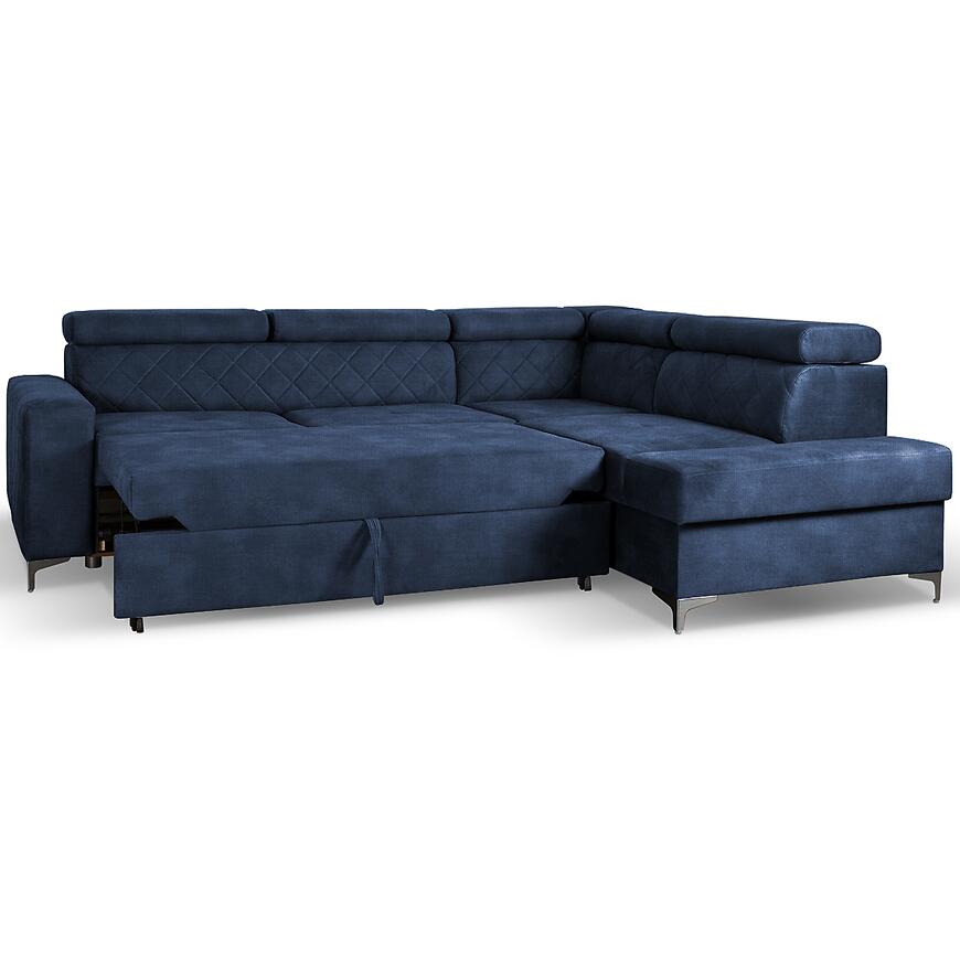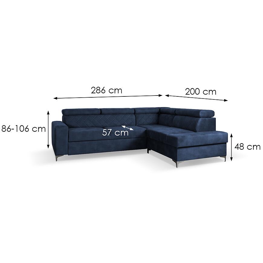 Narożnik Logan Wind 77 prawostronny to średniej wielkości narożnik w kształcie litery L o wymiarach 268×200 cm i wysokości 86/106 cm, tapicerowany niebieską tkaniną. Siedzisko wykonane ze sprężyny falistej gwarantuje komfort codziennego użytkowania. Narożnik posiada funkcję spania typu delfin z powierzchnią spania 121×200 cm oraz jeden pojemnik na pościel. Wyposażony jest w regulowane zagłówki i chromowane nogi. Produkt waży 164 kg, nie zawiera poduszek ani pufy, a jego montaż jest wymagany. Idealny do salonu, łącząc funkcjonalność z wygodą i estetyką.