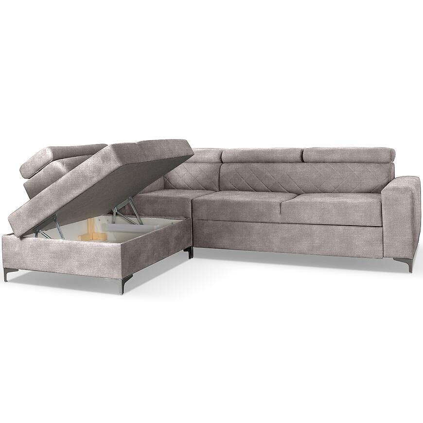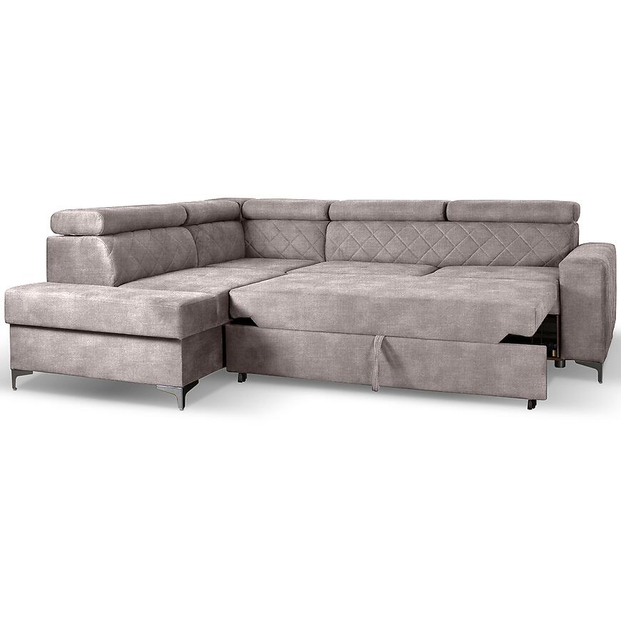 Narożnik Logan Wind 82 lewostronny to średniej wielkości narożnik w kształcie litery L o wymiarach 268×200 cm i wysokości 86/106 cm, tapicerowany beżową tkaniną. Siedzisko wypełnione sprężyną falistą zapewnia wygodę codziennego użytkowania. Narożnik posiada funkcję spania typu delfin z powierzchnią spania 121×200 cm oraz jeden pojemnik na pościel. Wyposażony jest w regulowane zagłówki i chromowane nogi. Produkt waży 164 kg, nie zawiera poduszek ani pufy, a jego montaż jest wymagany. Idealny do salonu, łącząc komfort, funkcjonalność i nowoczesny design.