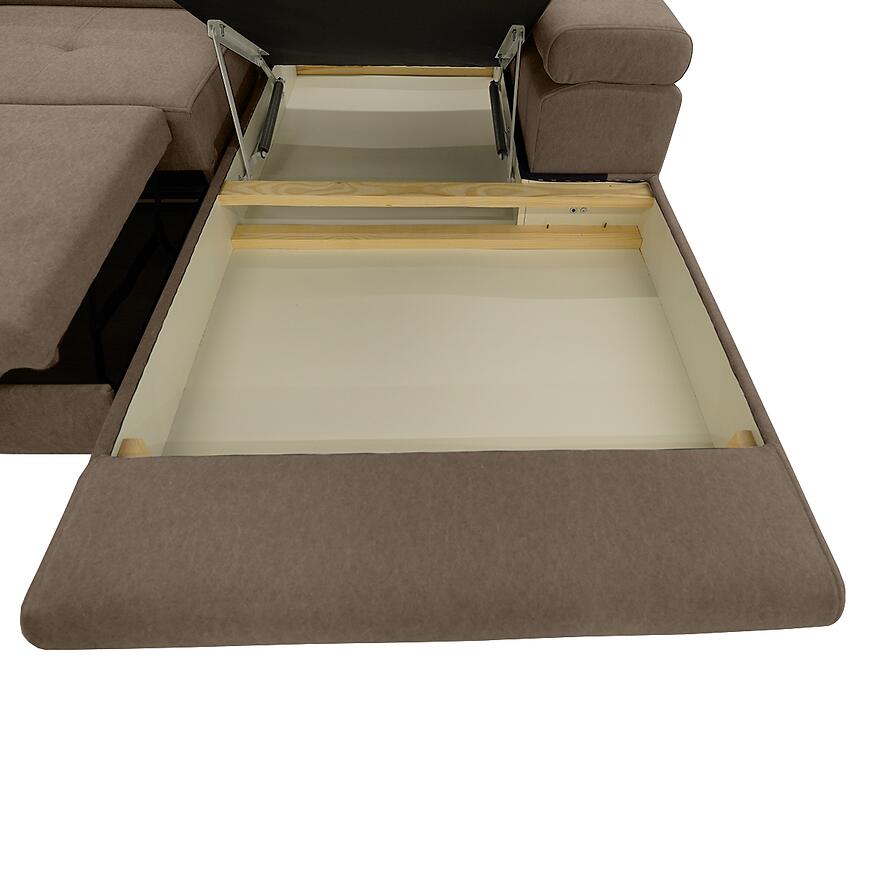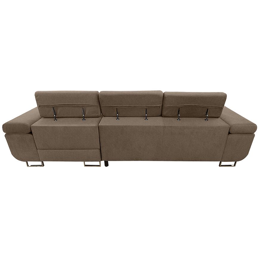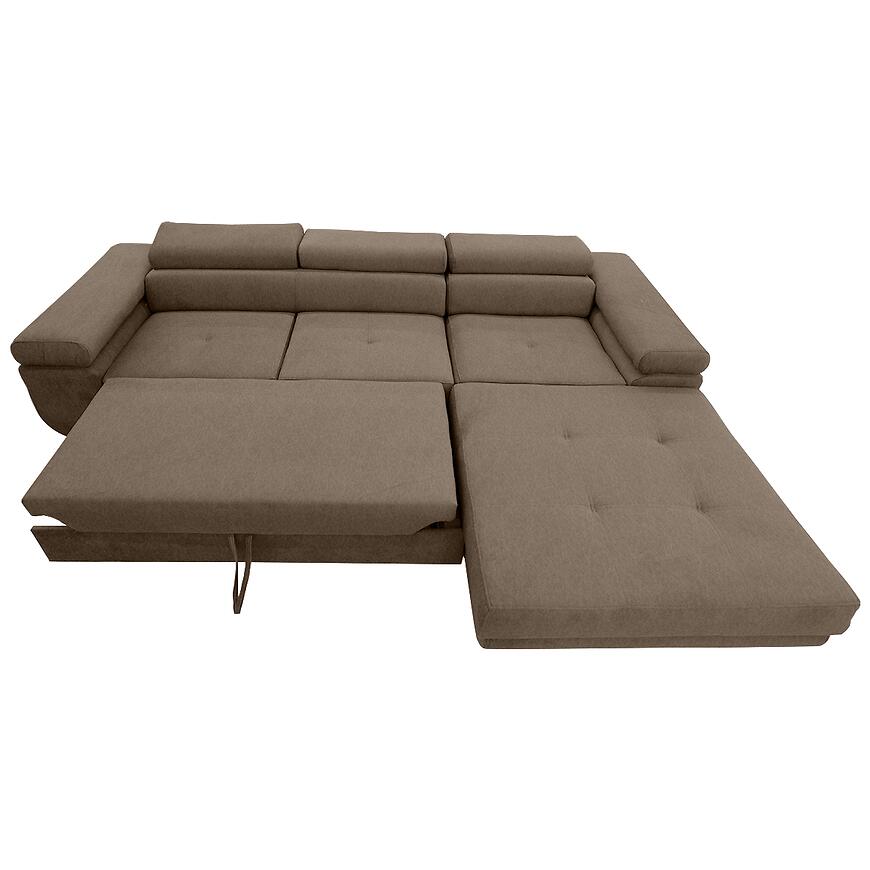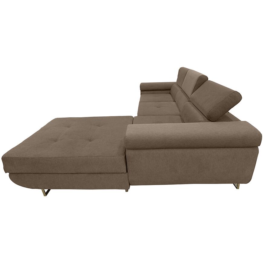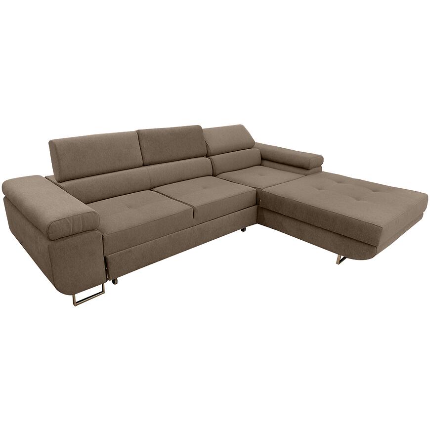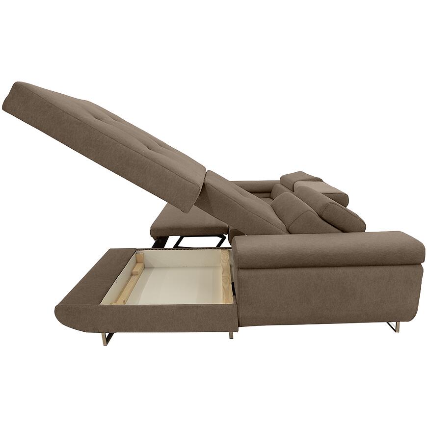 Narożnik z funkcją spania Lotus Castel 20 prawostronny to elegancki narożnik w nowoczesnym stylu, w kształcie litery L, łączący komfort z praktycznymi rozwiązaniami. Wyposażony w funkcję spania o powierzchni 125×193 cm z mechanizmem delfin oraz pojemnik na pościel, ułatwia codzienne użytkowanie. Tapicerowany trwałą brązową tkaniną, z wypełnieniem na sprężynie falistej, posiada regulowany zagłówek dla większej wygody. Stabilne chromowane nóżki dodają nowoczesnego charakteru. Solidny wybór dla osób ceniących komfort i funkcjonalność.