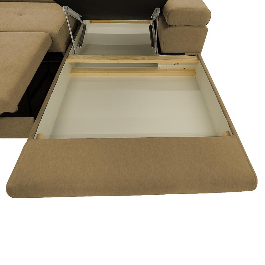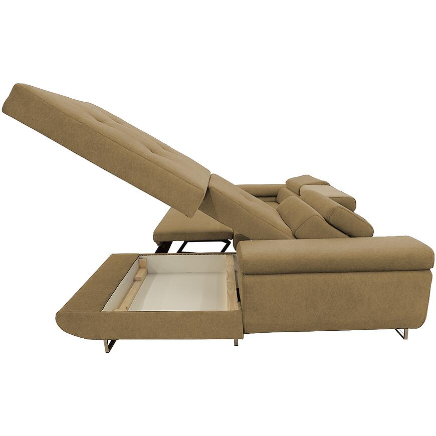 Narożnik z funkcją spania Lotus Castel 48 prawostronny to nowoczesny narożnik w stylu minimalistycznym, w kształcie litery L, łączący komfort i funkcjonalność. Wyposażony w funkcję spania o powierzchni 125×193 cm z mechanizmem delfin oraz pojemnik na pościel, ułatwia codzienne użytkowanie. Tapicerowany trwałą beżową tkaniną, z wypełnieniem na sprężynie falistej, posiada regulowany zagłówek dla większej wygody. Stabilne chromowane nóżki dodają nowoczesnego charakteru. Solidny wybór dla osób ceniących komfort i funkcjonalność.