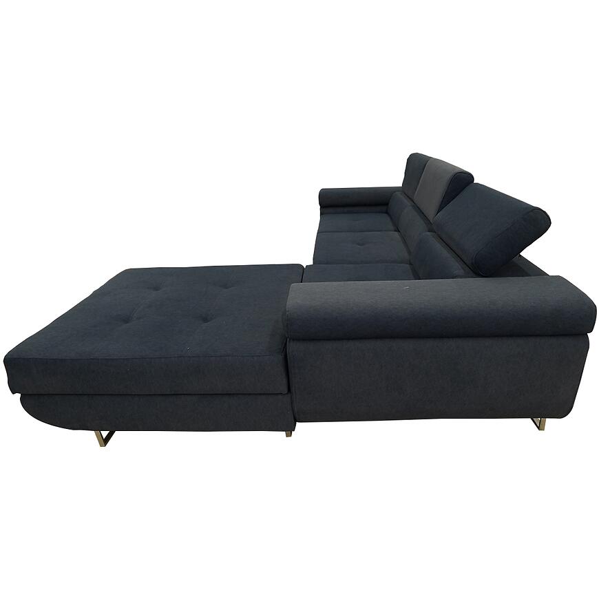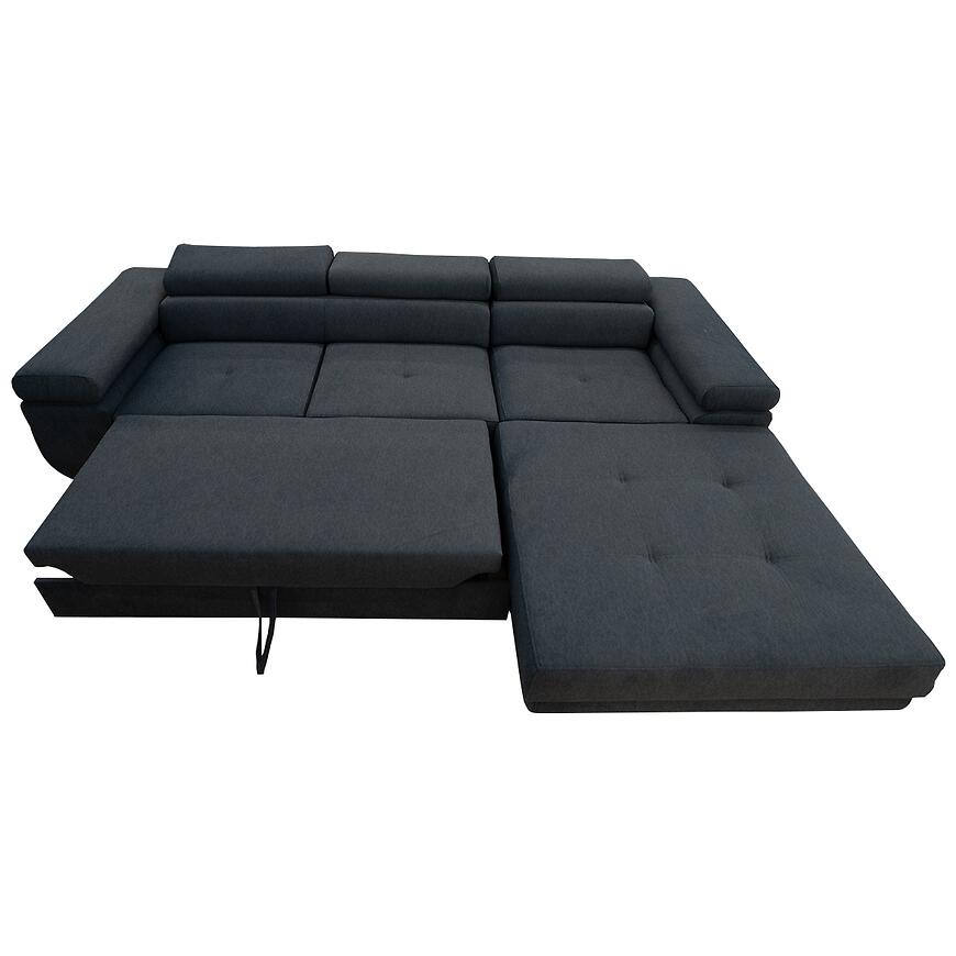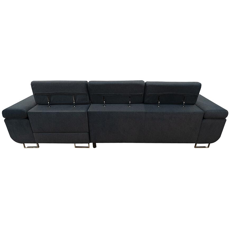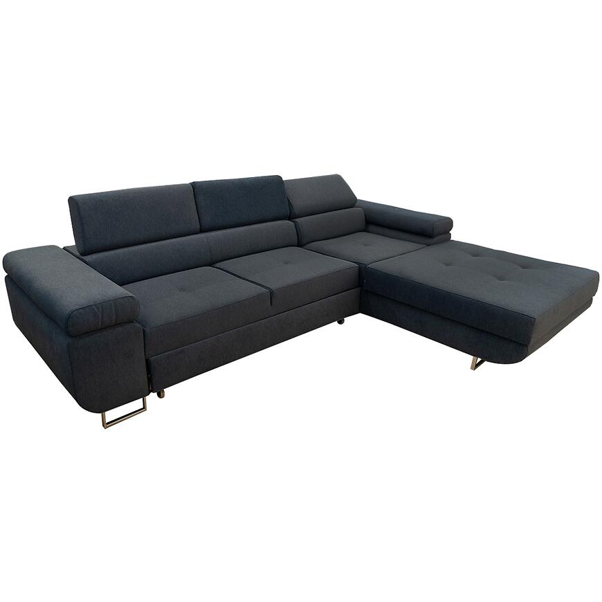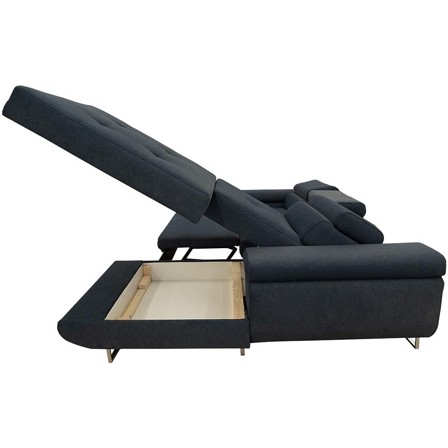 Narożnik z funkcją spania Lotus Castel 79 prawostronny to nowoczesny narożnik w stylu minimalistycznym, w kształcie litery L, łączący komfort i funkcjonalność. Posiada funkcję spania o powierzchni 125×193 cm z mechanizmem delfin oraz pojemnik na pościel, ułatwiający codzienne użytkowanie. Tapicerowany trwałą granatową tkaniną, z wypełnieniem na sprężynie falistej, wyposażony w regulowany zagłówek dla większej wygody. Stabilne chromowane nóżki podkreślają nowoczesny charakter mebla. Solidny wybór dla osób ceniących komfort i funkcjonalność.
