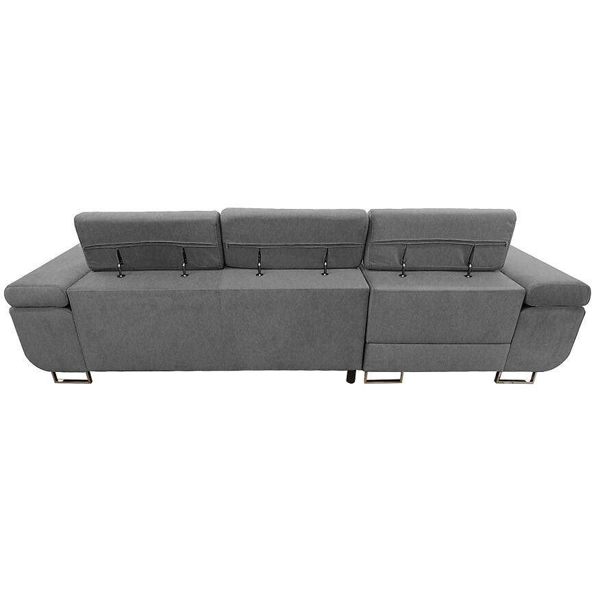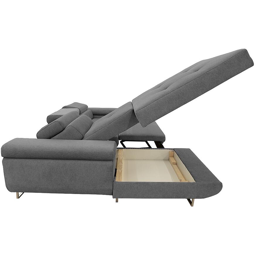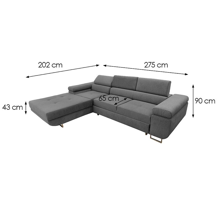 Narożnik z funkcją spania Lotus Castel 93 lewostronny to nowoczesny narożnik w stylu minimalistycznym, w kształcie litery L, łączący komfort i funkcjonalność. Posiada funkcję spania o powierzchni 125×193 cm z mechanizmem delfin oraz pojemnik na pościel, ułatwiający codzienne użytkowanie. Tapicerowany trwałą szarą tkaniną, z wypełnieniem na sprężynie falistej, wyposażony w regulowany zagłówek dla większej wygody. Stabilne chromowane nóżki podkreślają nowoczesny charakter mebla. Solidny wybór dla osób ceniących komfort i funkcjonalność.