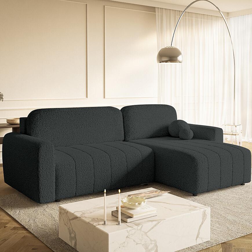 Narożnik Luna Coral 60 to nowoczesny i funkcjonalny mebel do salonu, który łączy komfort z eleganckim wyglądem. Tapicerowany w czarnej tkaninie, zapewnia wygodę dzięki sprężynie falistej w siedzisku. Wyposażony w funkcję spania o powierzchni 140x220 cm oraz pojemnik na pościel, idealnie sprawdzi się na co dzień i dla gości. System rozkładania DL ułatwia obsługę, a uniwersalna orientacja w kształcie litery L pasuje do różnych aranżacji wnętrz.