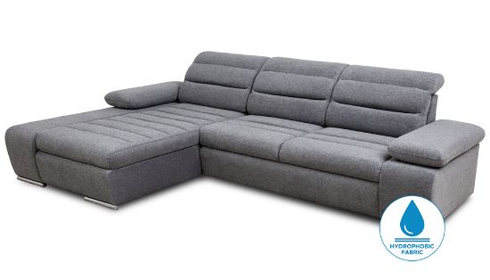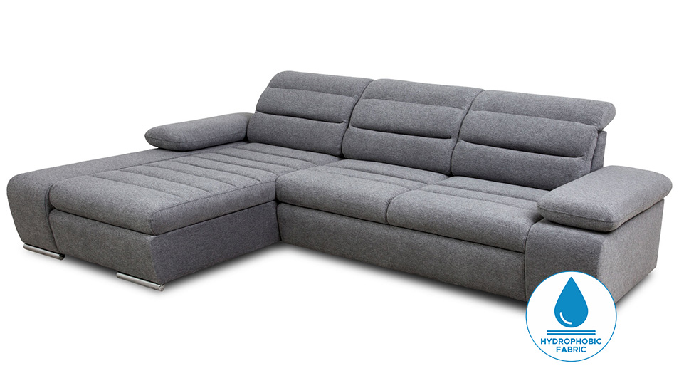 Narożnik wykonany został z wyjątkowej tkaniny Aragon, charakteryzującej się nie tylko trwałością, ale także praktycznością. Tkanina ta utrudnia wchłanianie wilgoci oraz płynów dzięki funkcji water repellent, co ułatwia utrzymanie mebla w czystości. Metalowe nóżki w kolorze chrom dodają narożnikowi lekkości i nowoczesności.