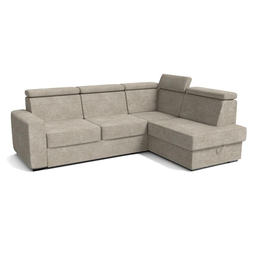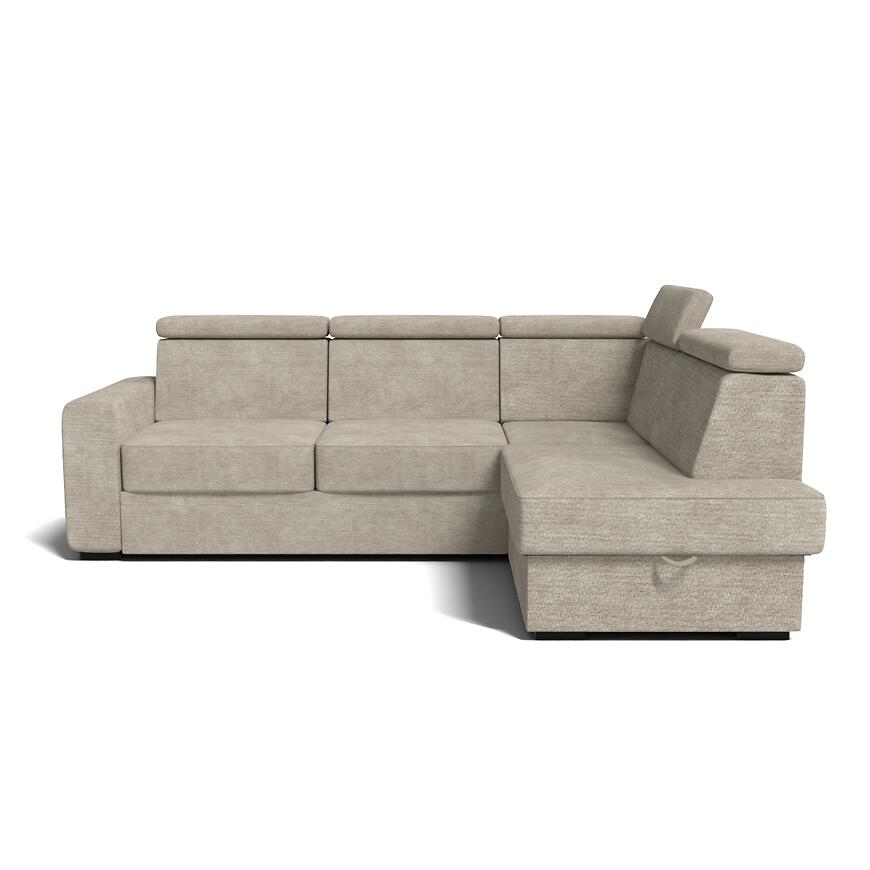 Regulowany zagłówek pozwala dopasować narożnik do indywidualnych potrzeb, zwiększając komfort wypoczynku. Drewniane nogi dodają elegancji i podkreślają nowoczesny charakter mebla.