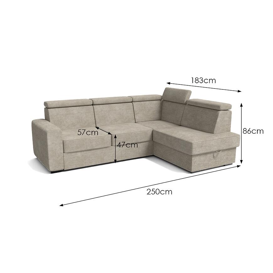 Powierzchnia spania 190x126 cm umożliwia komfortowy sen dla jednej lub dwóch osób. Narożnik wyposażony jest w mechanizm rozkładania typu wózek, który pozwala w łatwy sposób przekształcić narożnik w wygodne łóżko. Wysokość do siedziska wynosi 47 cm, a głębokość siedziska 58 cm, co zapewnia komfort codziennego użytkowania.