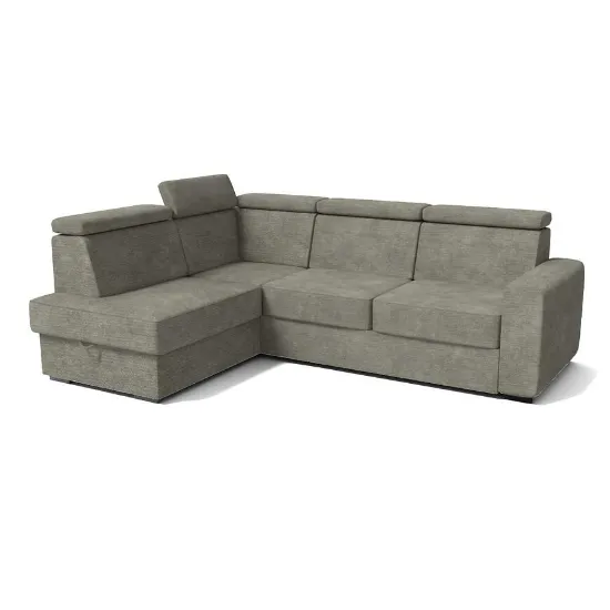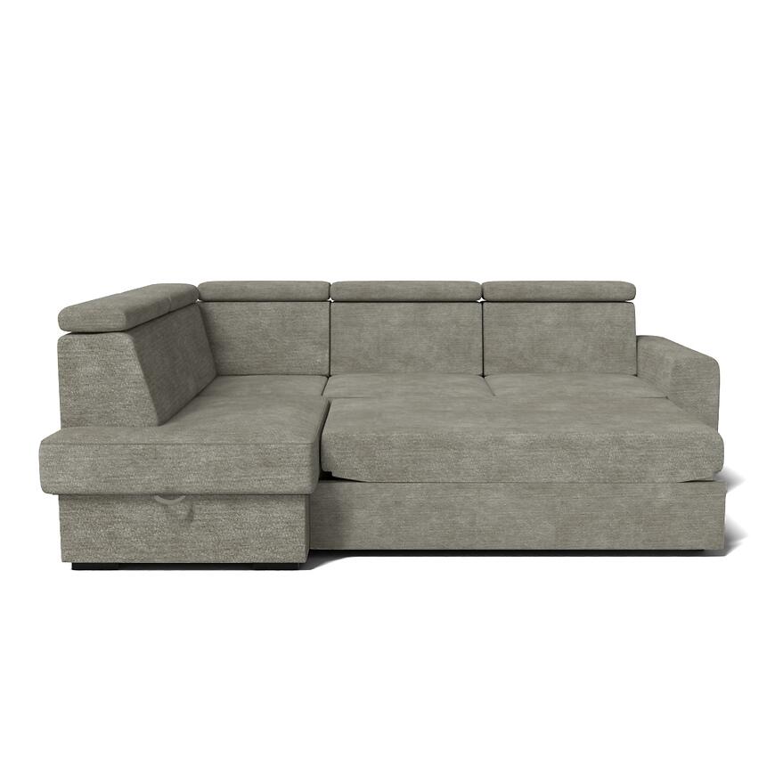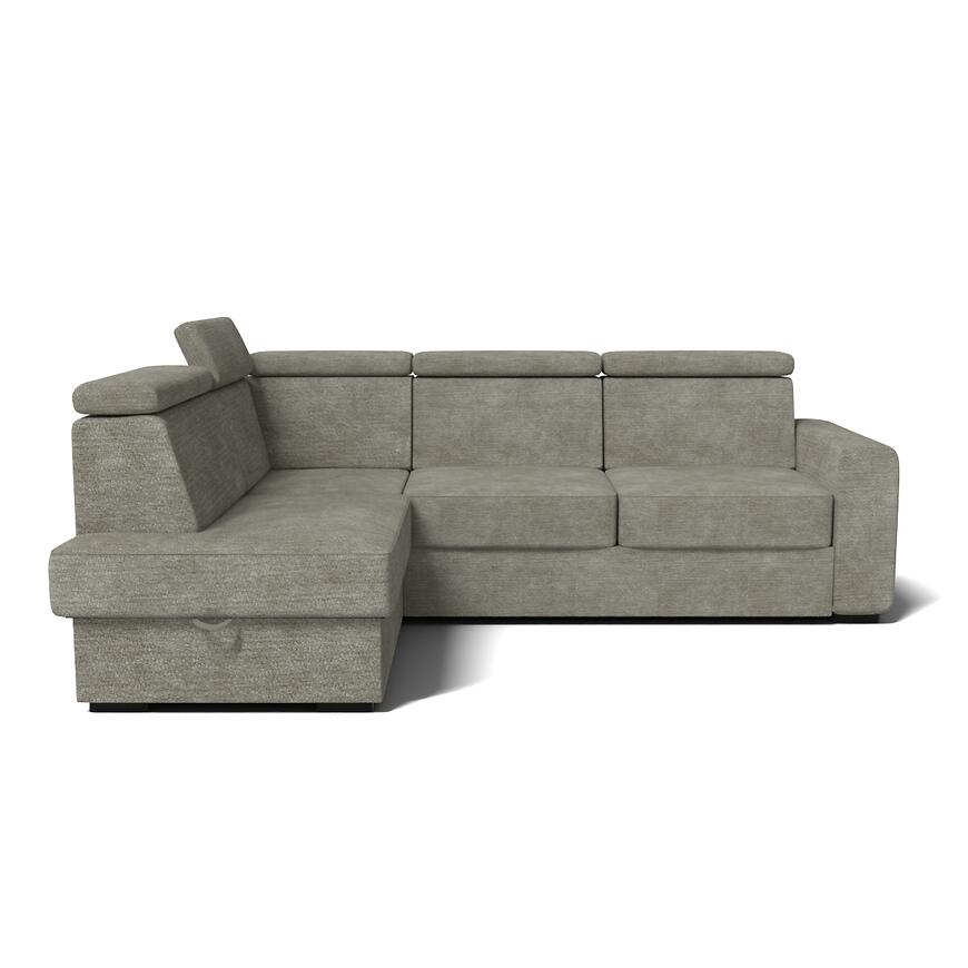 Regulowany zagłówek pozwala dopasować narożnik do indywidualnych potrzeb, zwiększając komfort wypoczynku. Drewniane nogi dodają narożnikowi elegancji i podkreślają jego nowoczesny charakter.