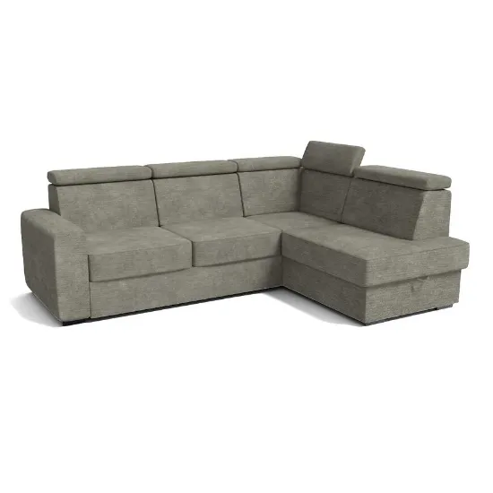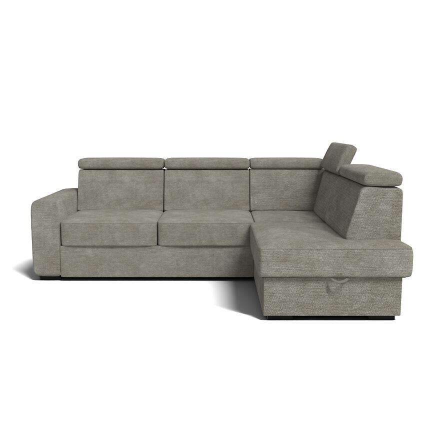 Regulowany zagłówek pozwala dopasować pozycję do indywidualnych potrzeb i zwiększa komfort wypoczynku. Drewniane nogi dodają narożnikowi elegancji, podkreślając jego nowoczesny charakter.