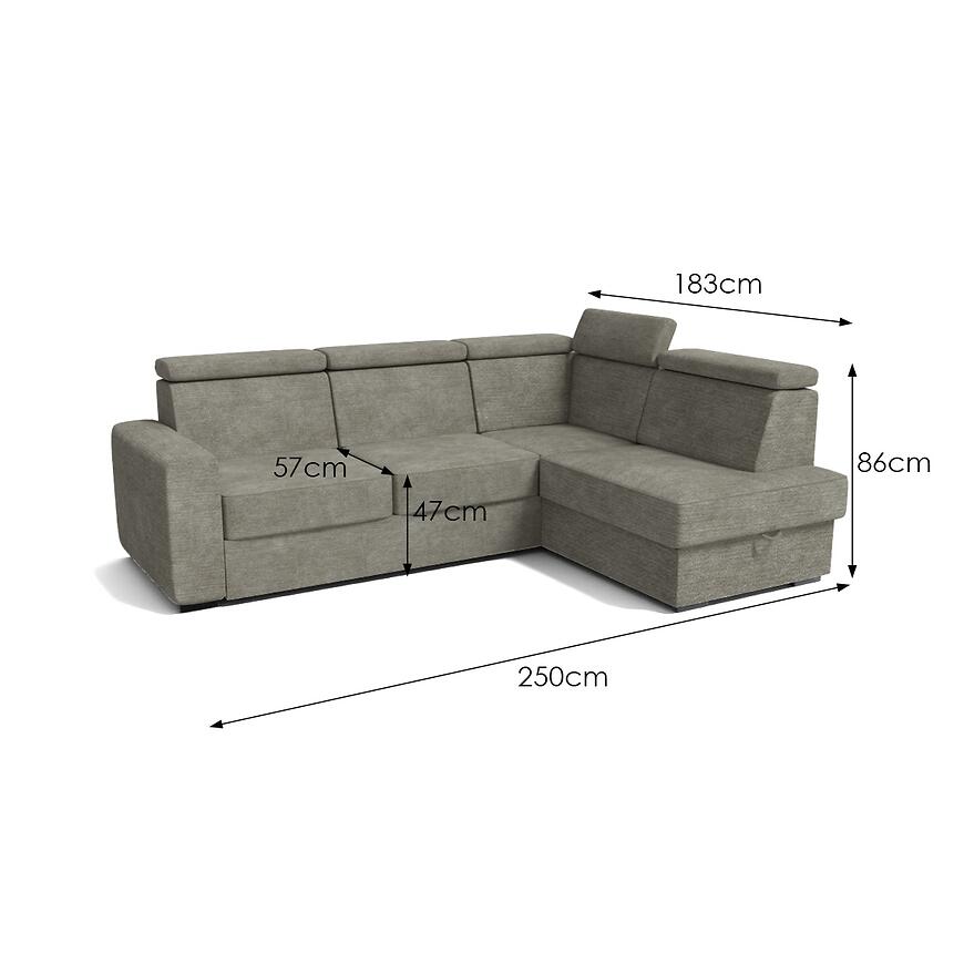 Powierzchnia spania 190x126 cm umożliwia komfortowy sen dla jednej lub dwóch osób. Narożnik wyposażony jest w mechanizm rozkładania typu wózek, który pozwala na szybkie i łatwe przekształcenie narożnika w wygodne miejsce do spania. Wysokość do siedziska wynosi 47 cm, a głębokość siedziska 58 cm, co zapewnia wygodę użytkowania.