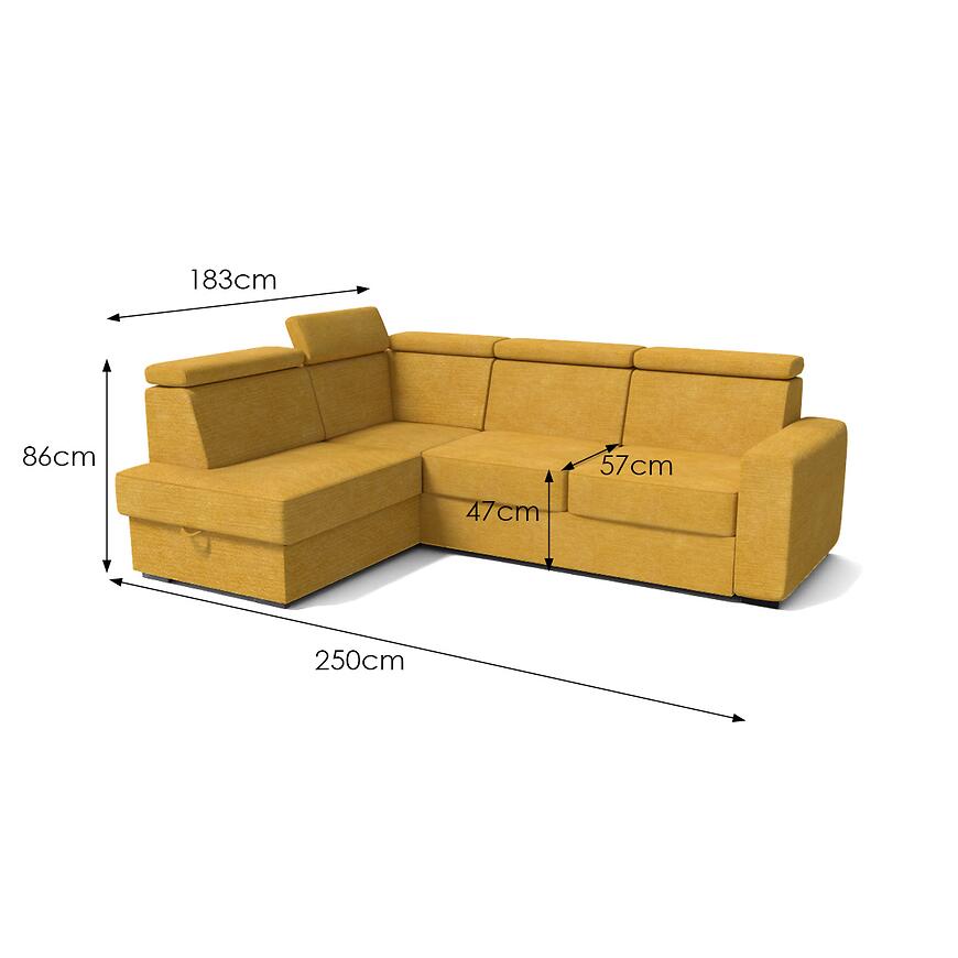 Narożnik Manhattan Vibe 53 w kolorze musztardowym to narożnik lewostronny, który wyróżnia się komfortem i nowoczesnym stylem. Model w kształcie litery L oferuje wygodne miejsce do codziennego wypoczynku oraz praktyczną przestrzeń do spania. Siedzisko wypełnione sprężynami typu B, pianką poliuretanową T30/38 oraz owatą zapewnia stabilne i wygodne podparcie ciała.