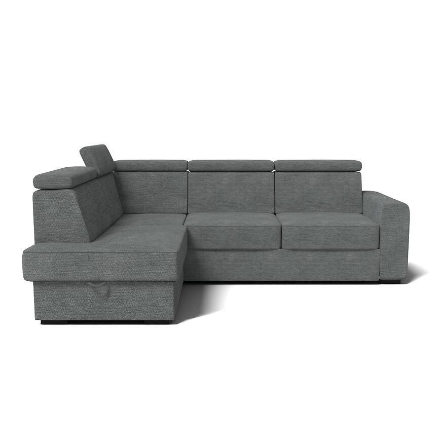Regulowany zagłówek pozwala dopasować narożnik do indywidualnych potrzeb, zwiększając wygodę wypoczynku. Drewniane nogi dodają narożnikowi elegancji i podkreślają jego nowoczesny charakter.