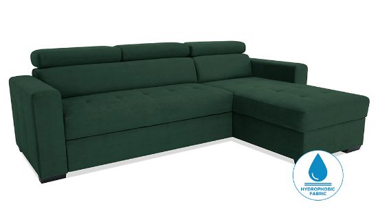 Narożnik Marco został wykonany z tkaniny hydrofobowej Zetta w pięknym, zielonym kolorze. Ta tkanina hydrofobowa ma nie tylko elegancki wygląd, ale również praktyczne właściwości. Ogranicza wchłanianie rozlanych płynów, dzięki czemu możesz cieszyć się spokojem i poczuciem bezpieczeństwa, nawet jeśli masz dzieci lub zwierzęta w domu.