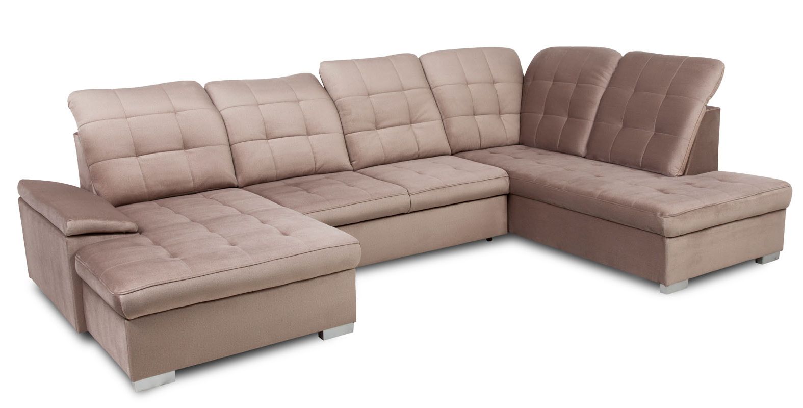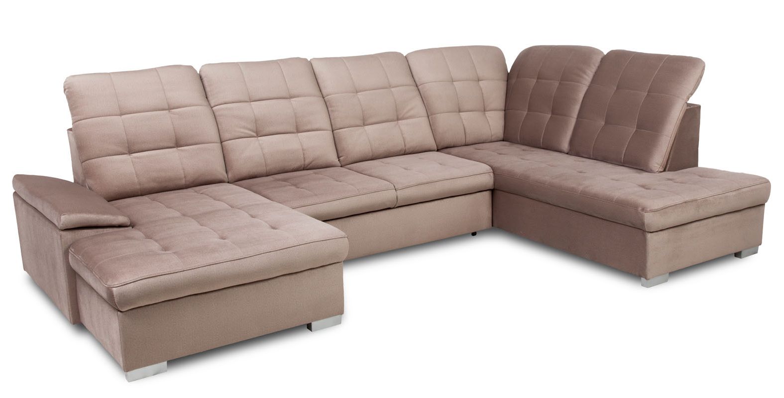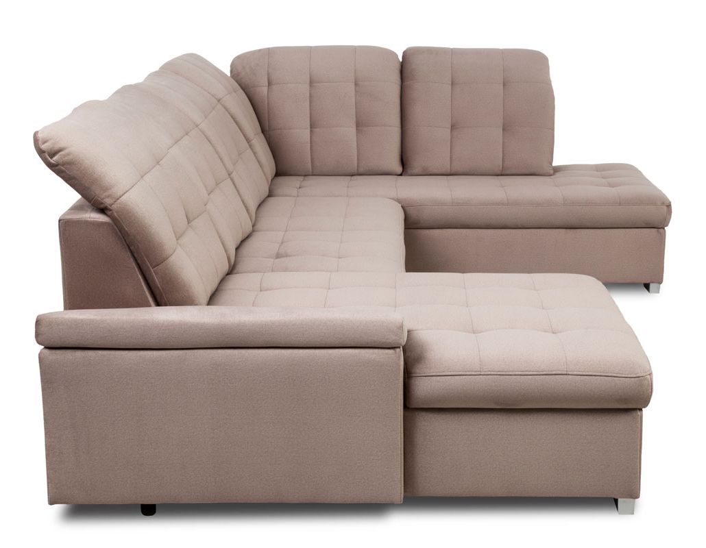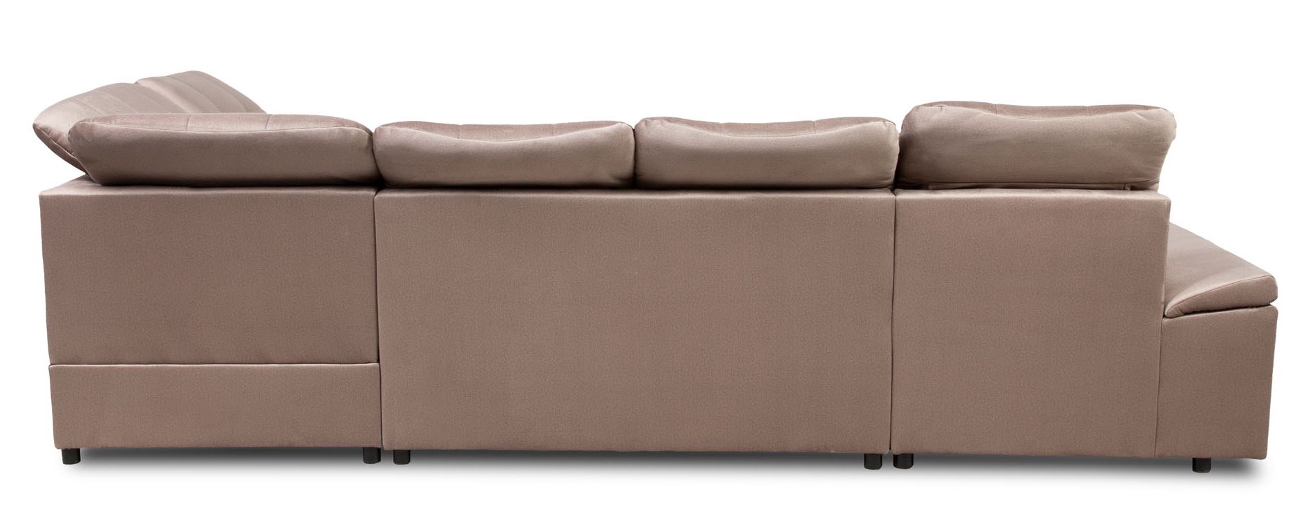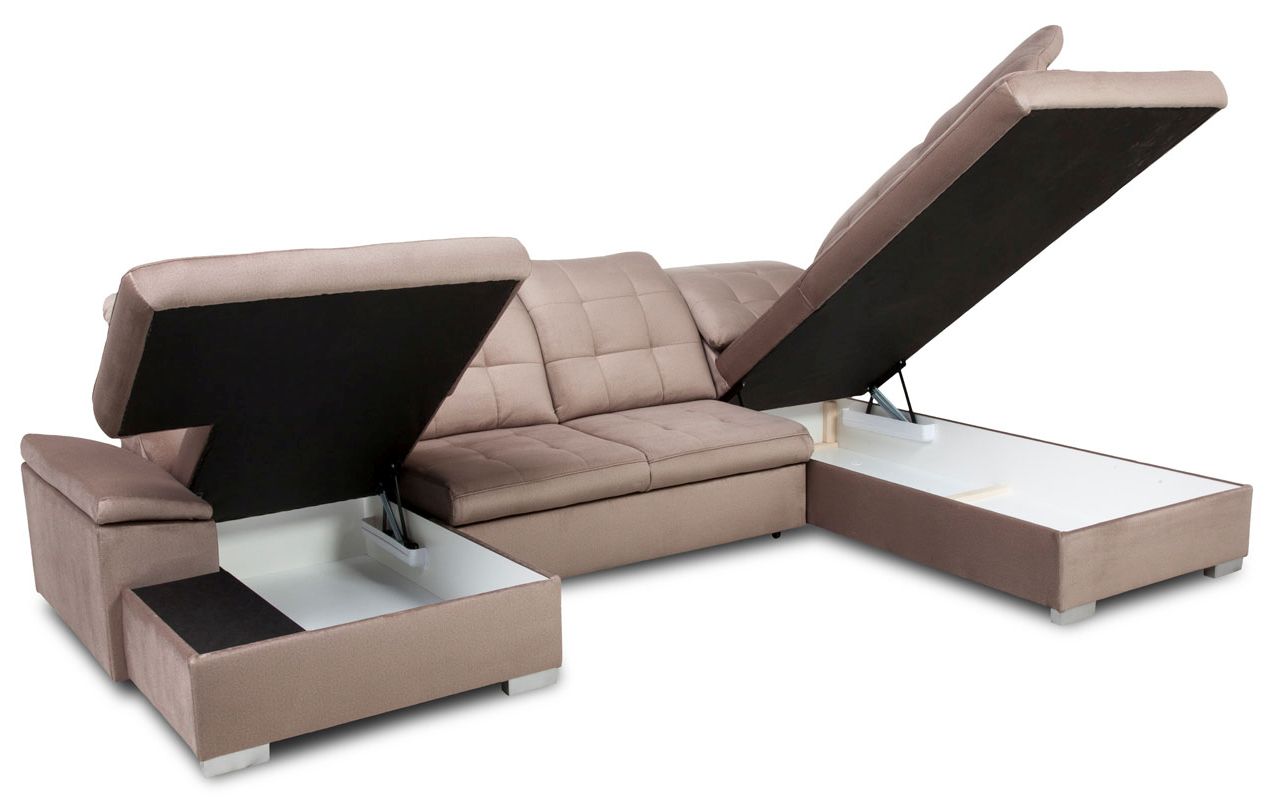Narożnik posiada dwa praktyczne pojemniki na pościel umieszczone w otomanach mebla, co pozwala na sprytne wykorzystanie przestrzeni i przechowywanie dodatkowego wyposażenia łóżkowego. Oparcie narożnika stanowią na stałe przymocowane poduszki, z czego trzy z nich posiadają stopniową regulację w górnej części, pełniąc jednocześnie funkcję regulowanego zagłówka. To innowacyjne rozwiązanie pozwala dostosować mebel do indywidualnych preferencji użytkowników.