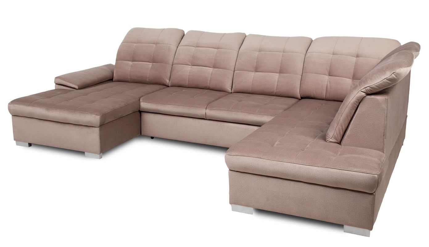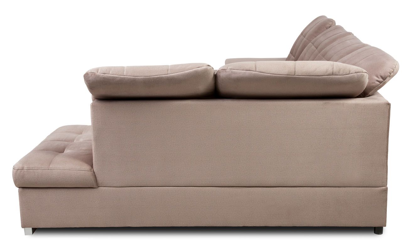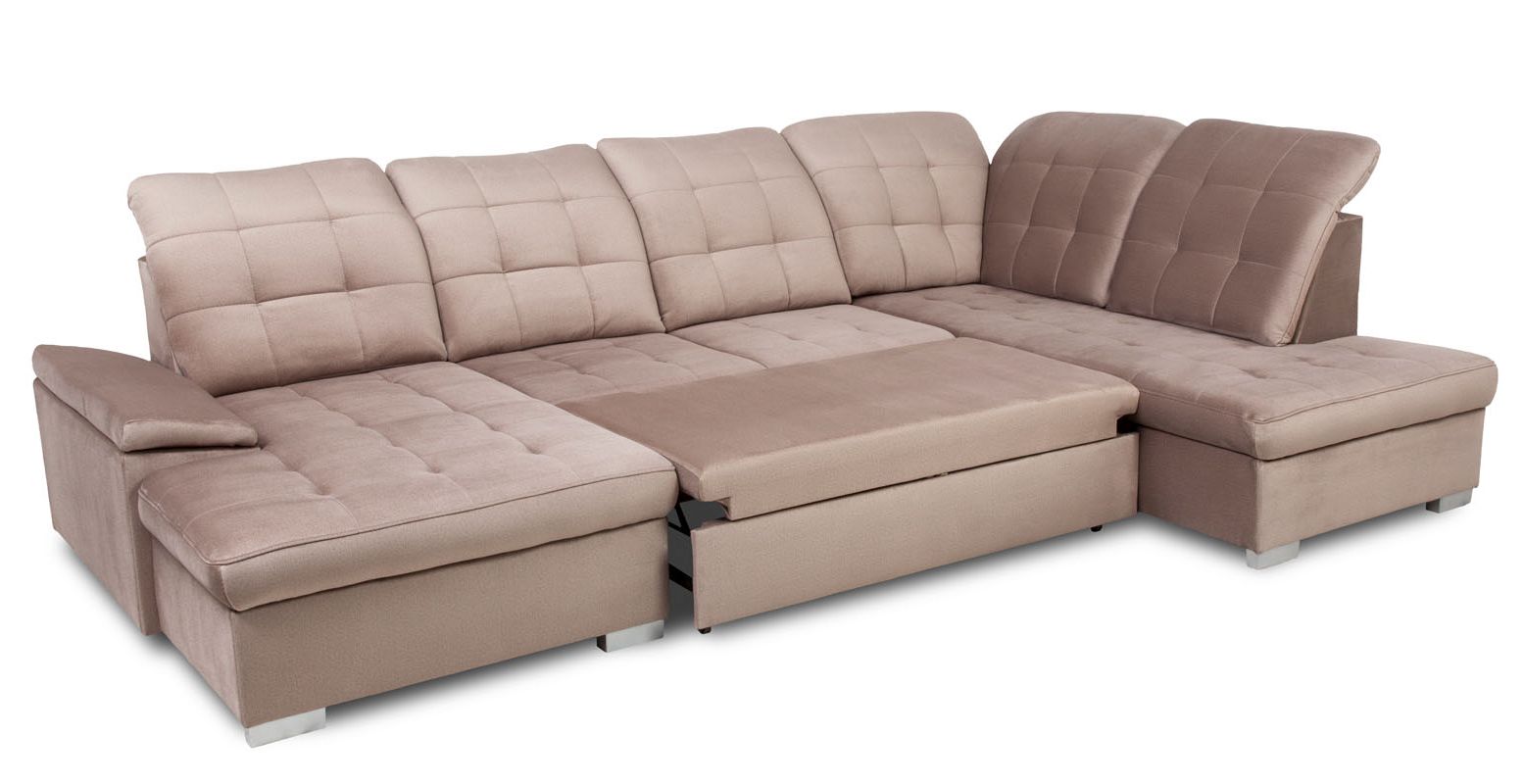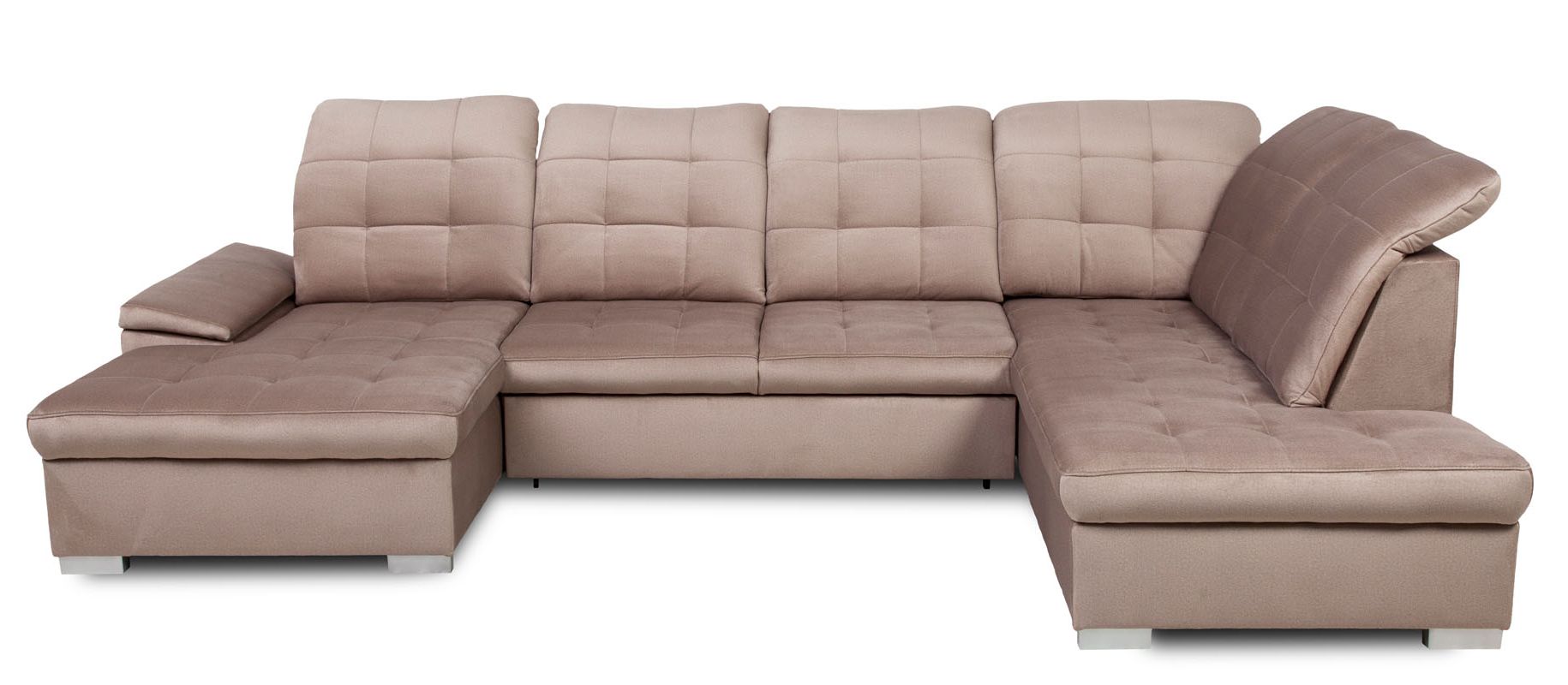 Narożnik posiada dwa praktyczne pojemniki na pościel umieszczone w otomanach mebla, co pozwala na sprytne wykorzystanie przestrzeni i przechowywanie dodatkowego wyposażenia łóżkowego. Oparcie narożnika stanowią na stałe przymocowane poduszki, z czego trzy z nich posiadają stopniową regulację w górnej części, pełniąc jednocześnie funkcję regulowanego zagłówka. To innowacyjne rozwiązanie pozwala dostosować mebel do indywidualnych preferencji użytkowników.